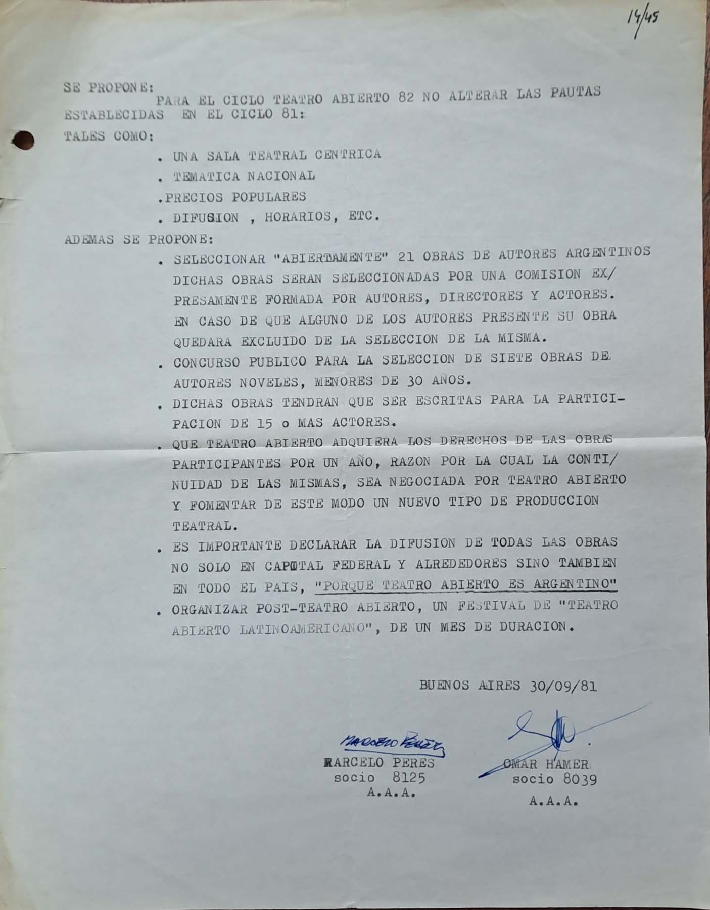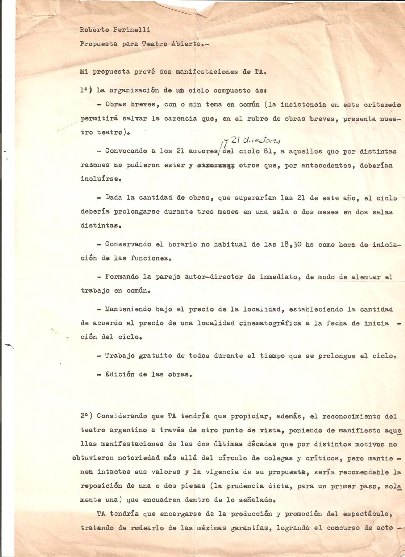 - Propuesta de Roberto Perinelli para Teatro Abierto 1982