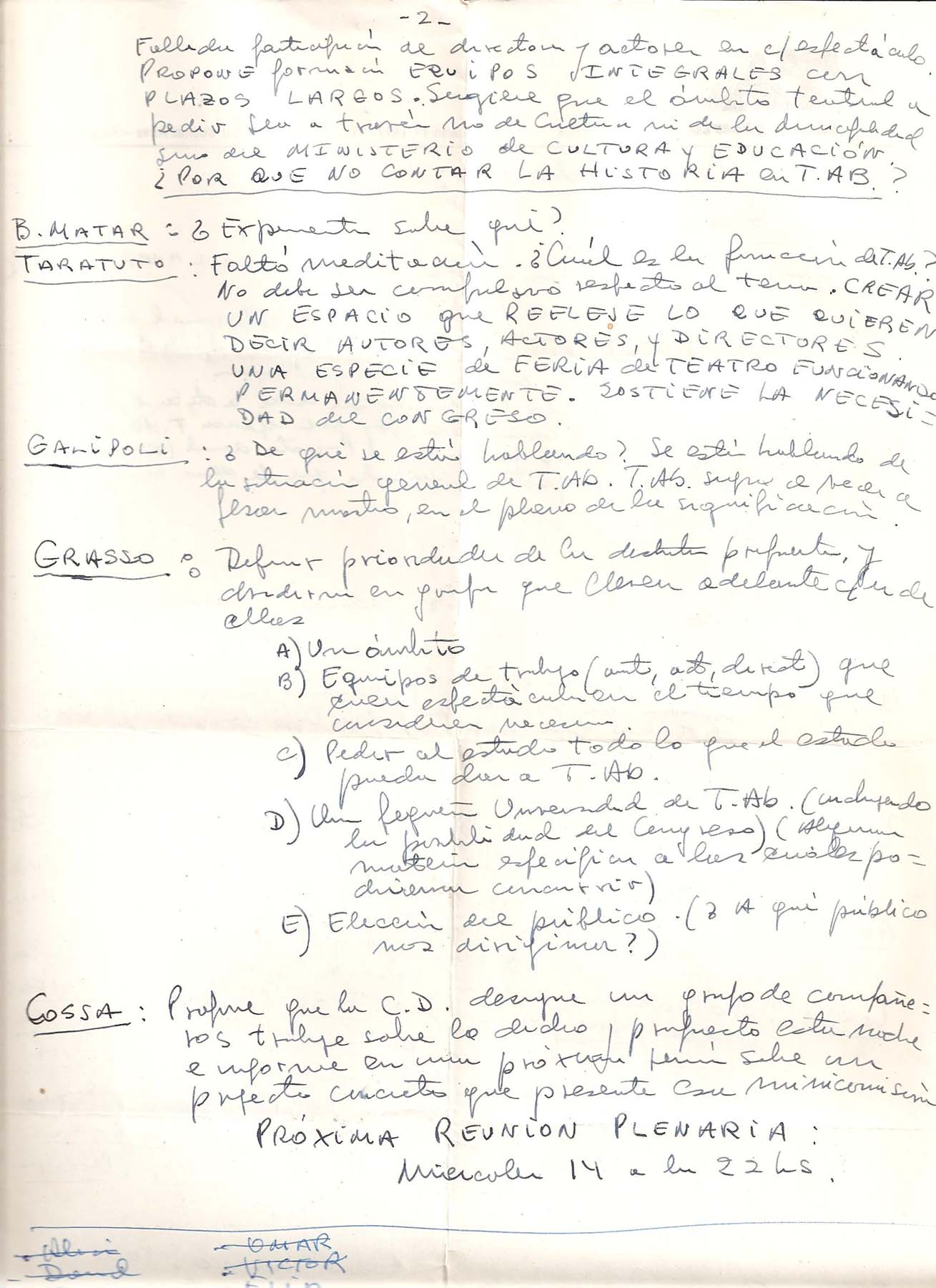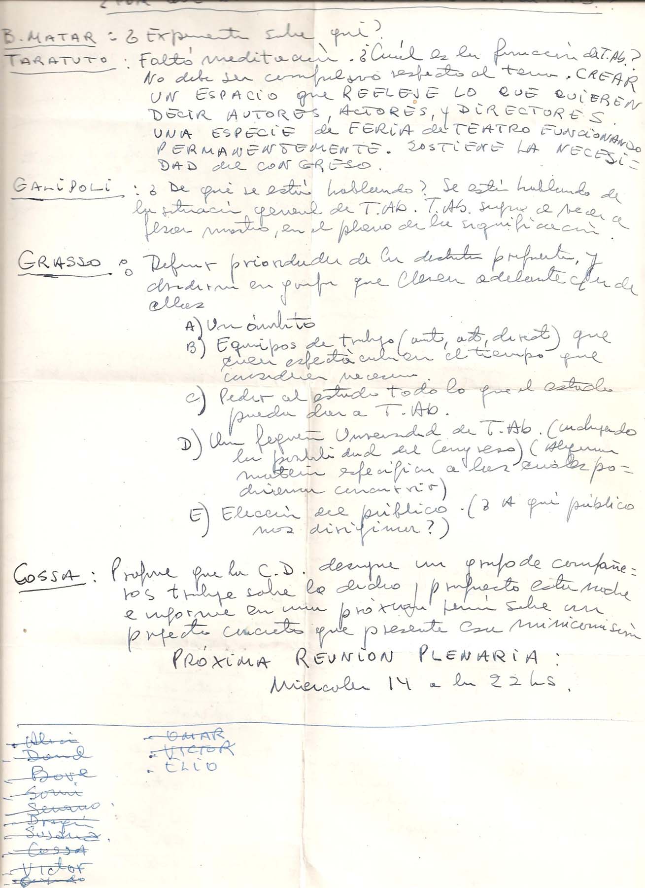 Actas y documentos asamblearios tomados por Osvaldo Dragún o materiales a disposición de la asamblea desde el final de Teatro Abierto 1983 a 1986.