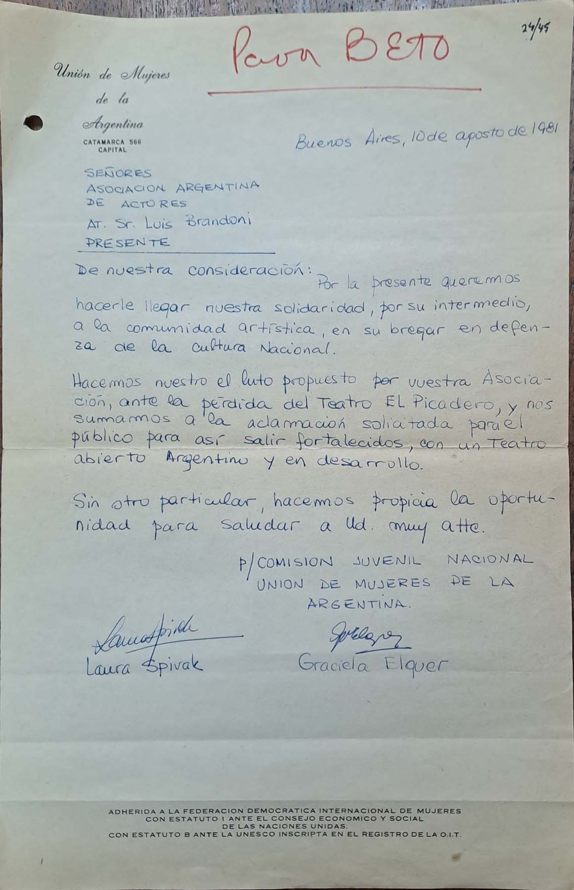 Carta de solidaridad de la Comisión Juvenil de la Unión de Mujeres Argentinas (UMA), vínculada al Partido Comunista Argentino, en solidaridad con Teatro Abierto frente al incendio del Teatro del Picadero. 10.08.1981.