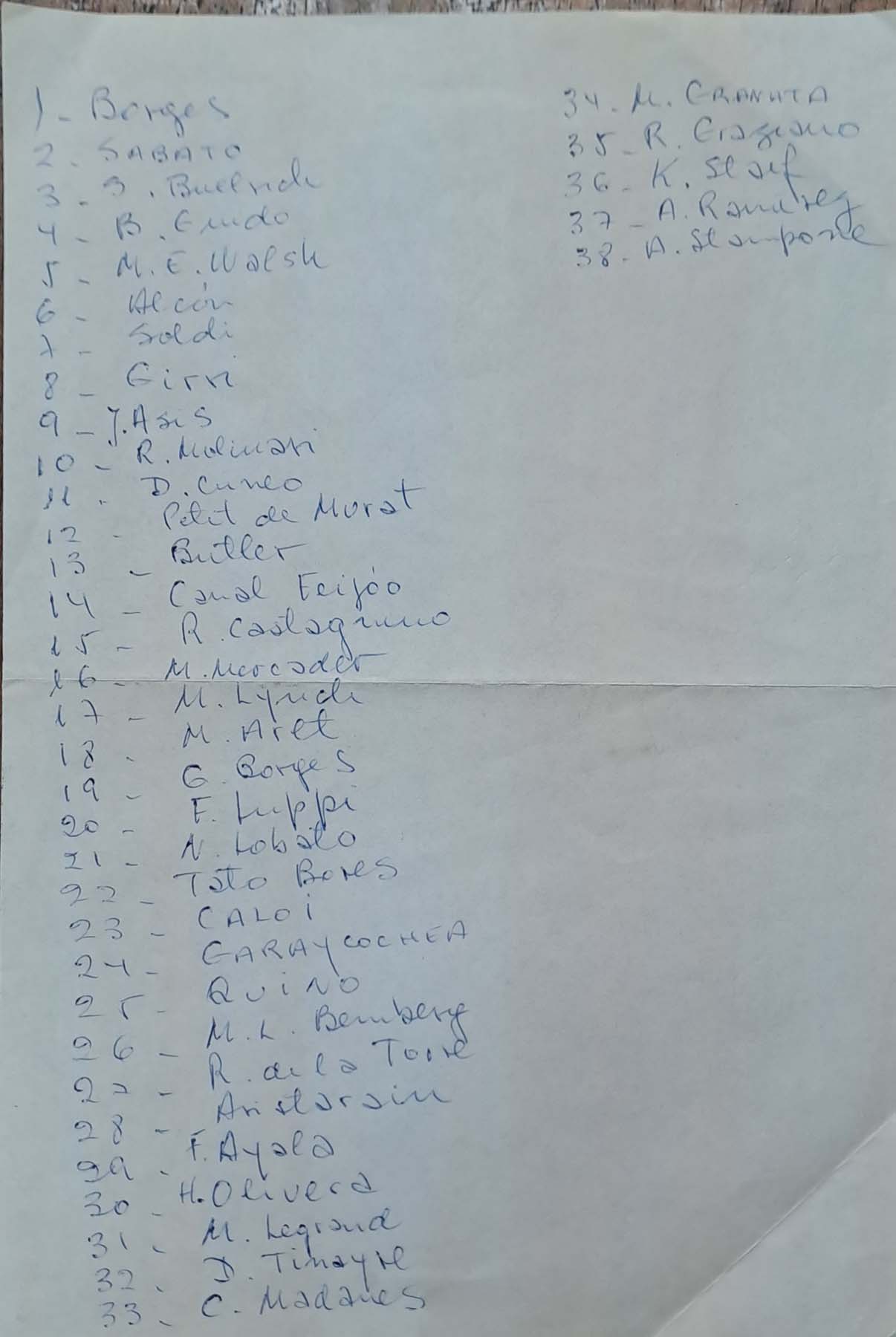 Lista de adhesiones confeccionada por Osvaldo Dragún previamente a la asamblea realizada en el Teatro Lasalle. En esa instancia, el movimiento decidió continuar las funciones del ciclo 1981 en el Teatro Tabarís y logró congregar a personalidades destacadas de diversos ámbitos culturales de Argentina. 10.08.1981.