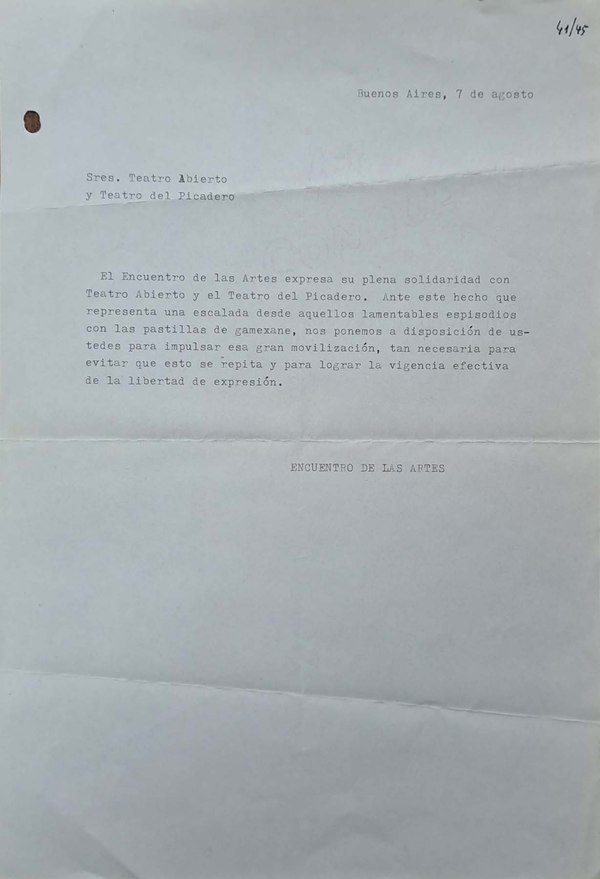 Carta del Encuentro de las Artes, espacio frentista impulsado por el Partido Socialista de los Trabajadores (PST) en solidaridaridad con Teatro Abierto frente al incendio del Teatro del Picadero. 07.08.1981.