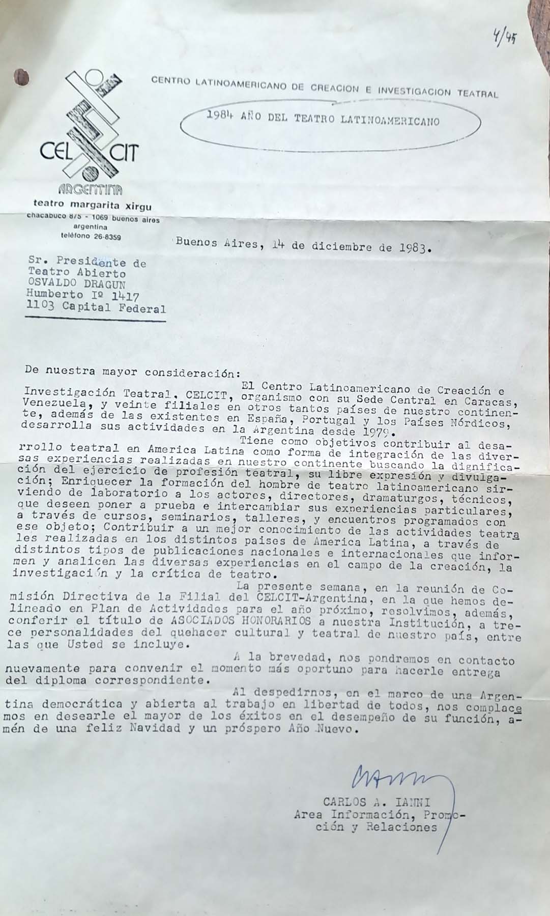 Nombramiento de Osvaldo Dragún como miembro honorario del CELCIT. 14.12.1983.