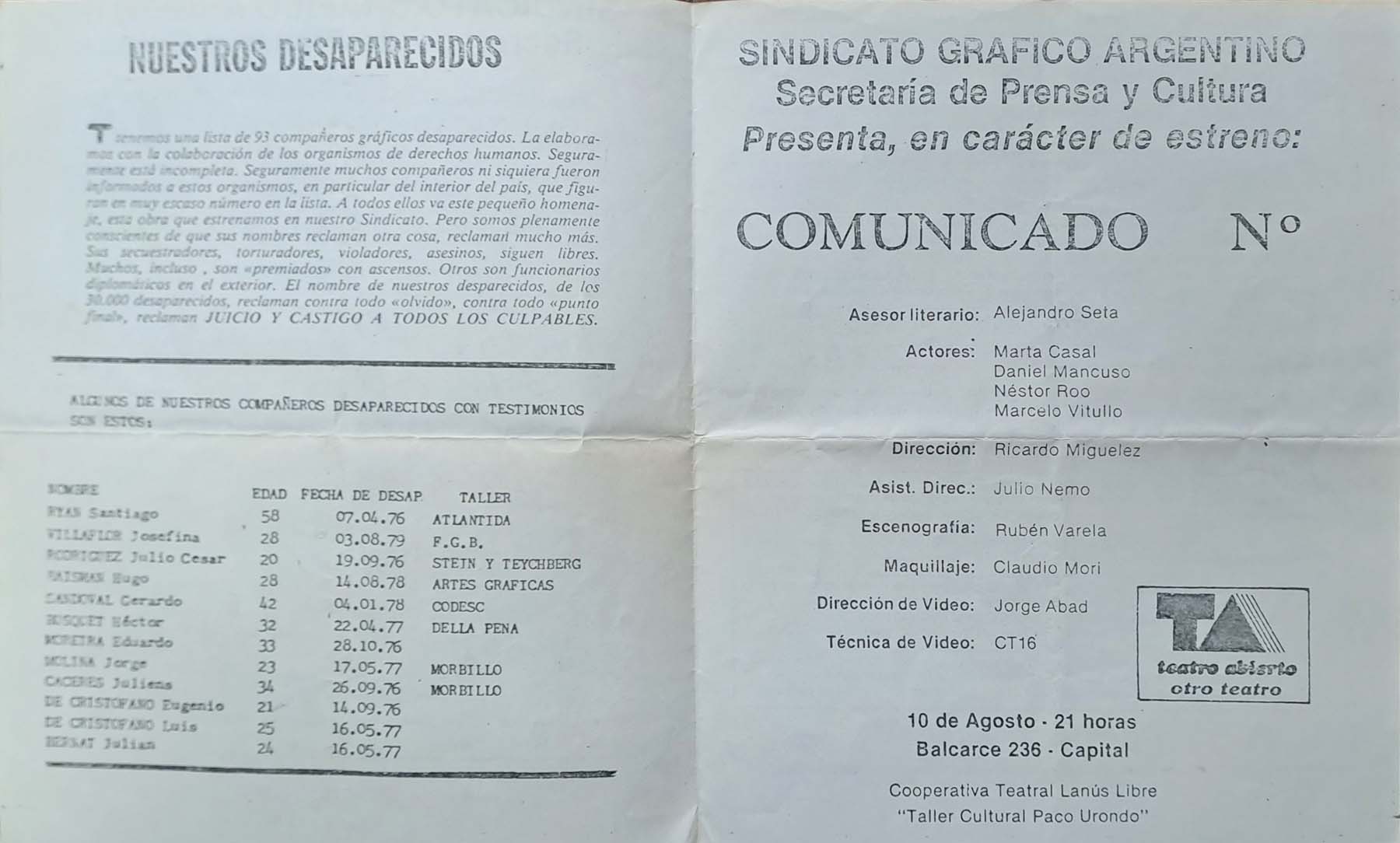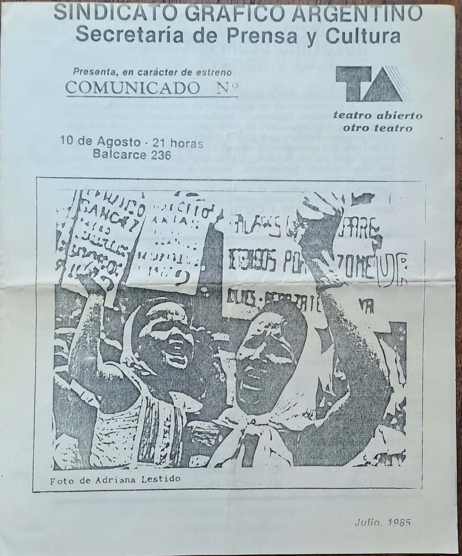 Programa del estreno de Comunicado Nº en el marco del proyecto Otro Teatro