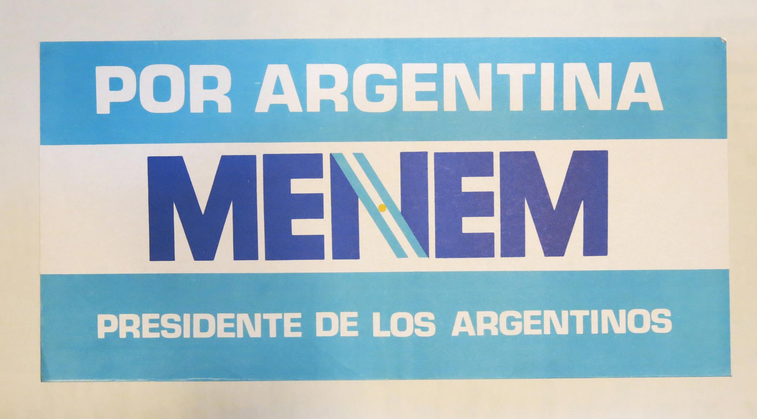 Se lee: “Por Argentina MENEM presidente de los Argentinos”. Impreso sobre bandera argentina.