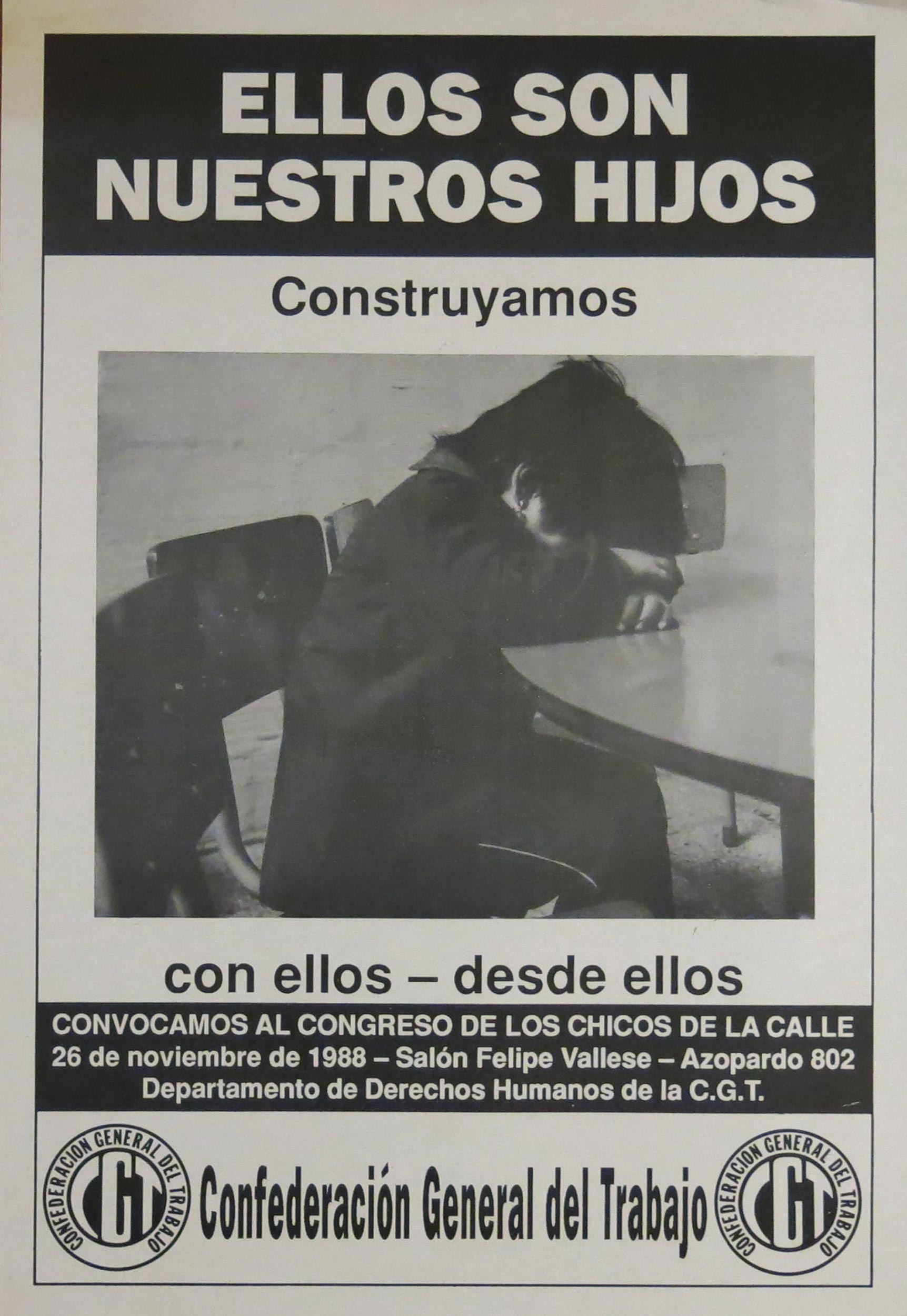 Afiche en blanco y negro, imagen de niño sentado con la cabeza sobre la mesa. Se lee: “Ellos son nuestros hijos. Construyamos con ellos-desde ellos. Convocamos al Congreso de los chicos de la calle. Departamento de Derechos Humanos de la C.G.T.”.