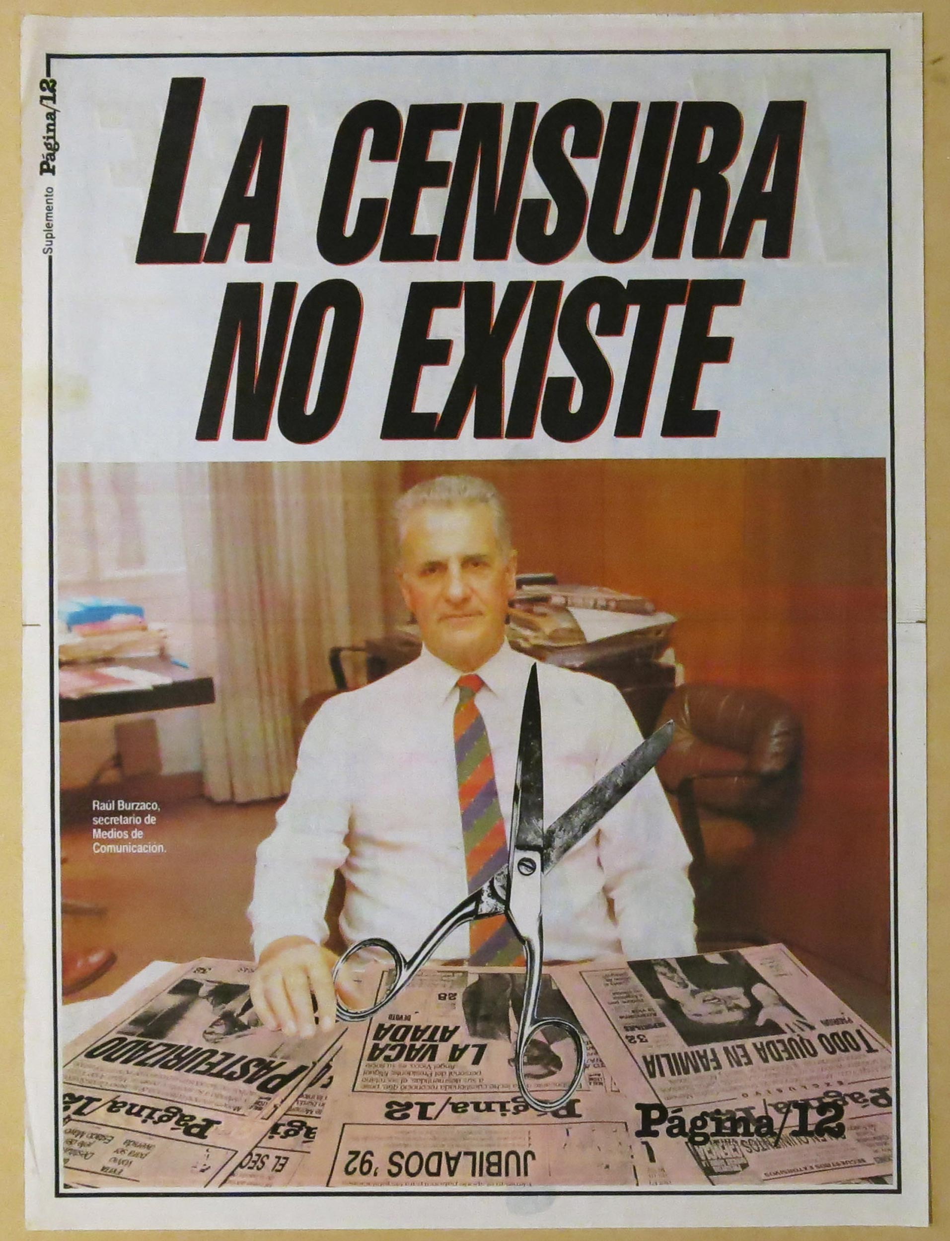 Anverso: Imagen a color de Burzaco con una gran tijera en la mano y distintas tapas del diario. “La censura no existe. Raúl Burzaco, secretario de Medios de Comunicación”.