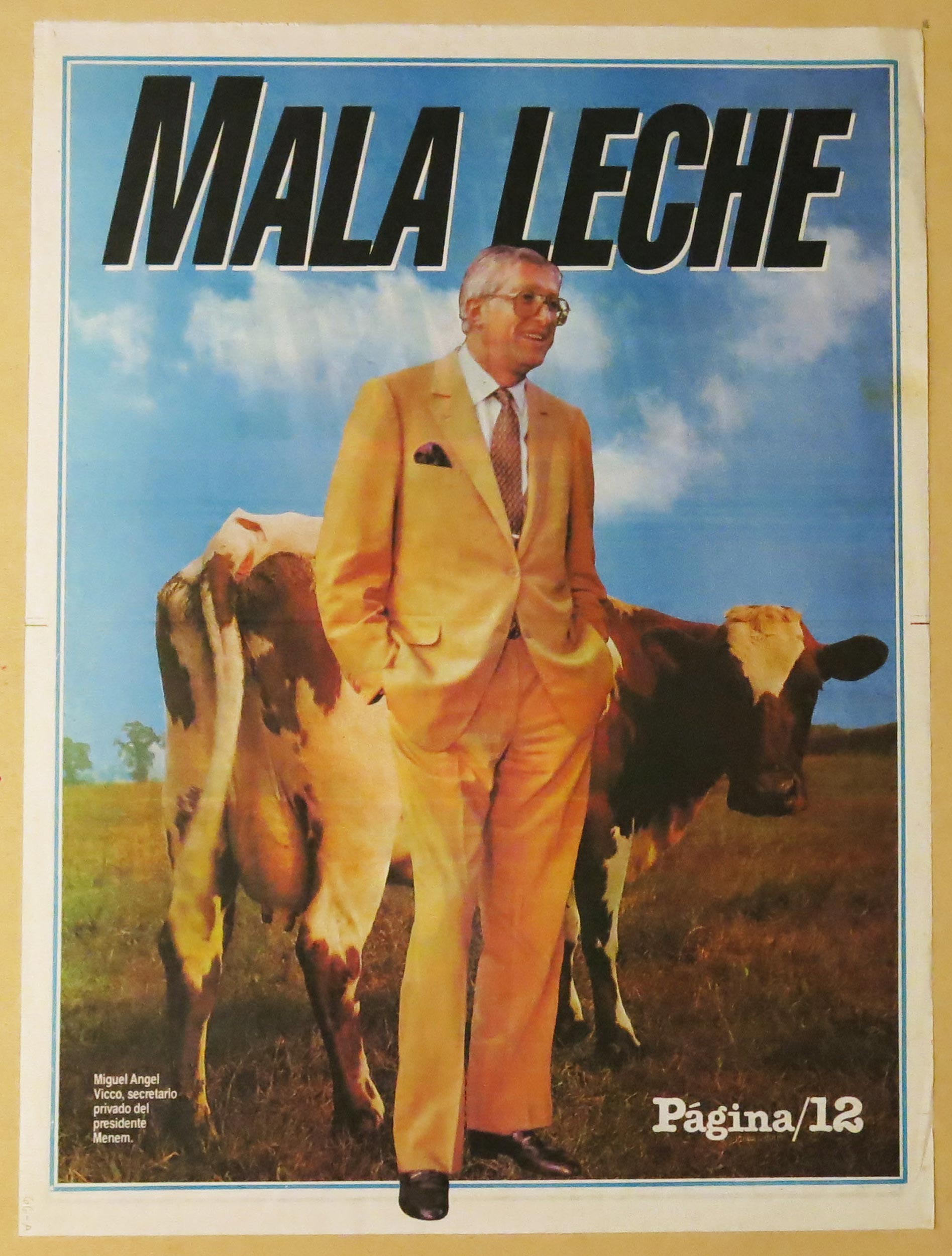Reverso: Imagen a color de Vicco de pie en el campo y vaca de fondo. “Mala leche. Miguel Angel Vicco, secretario privado del presidente Menem”.