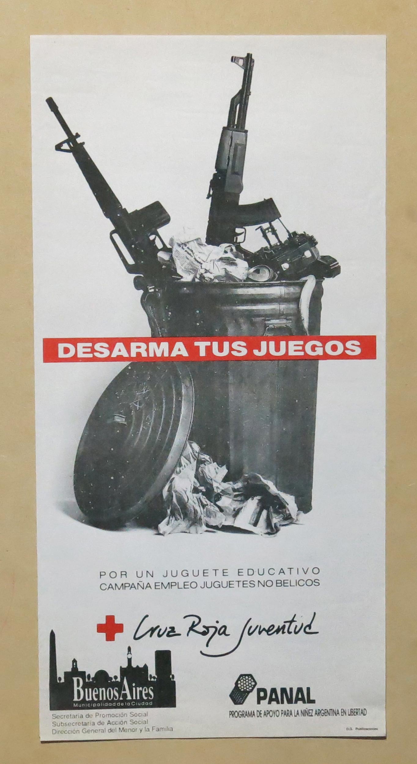 Se lee: "Desarma tus juegos. Por un juguete educativo, Campaña empleo juguetes no bélicos", junto a una imagen de tacho de basura en grises con armas de juguete adentro.