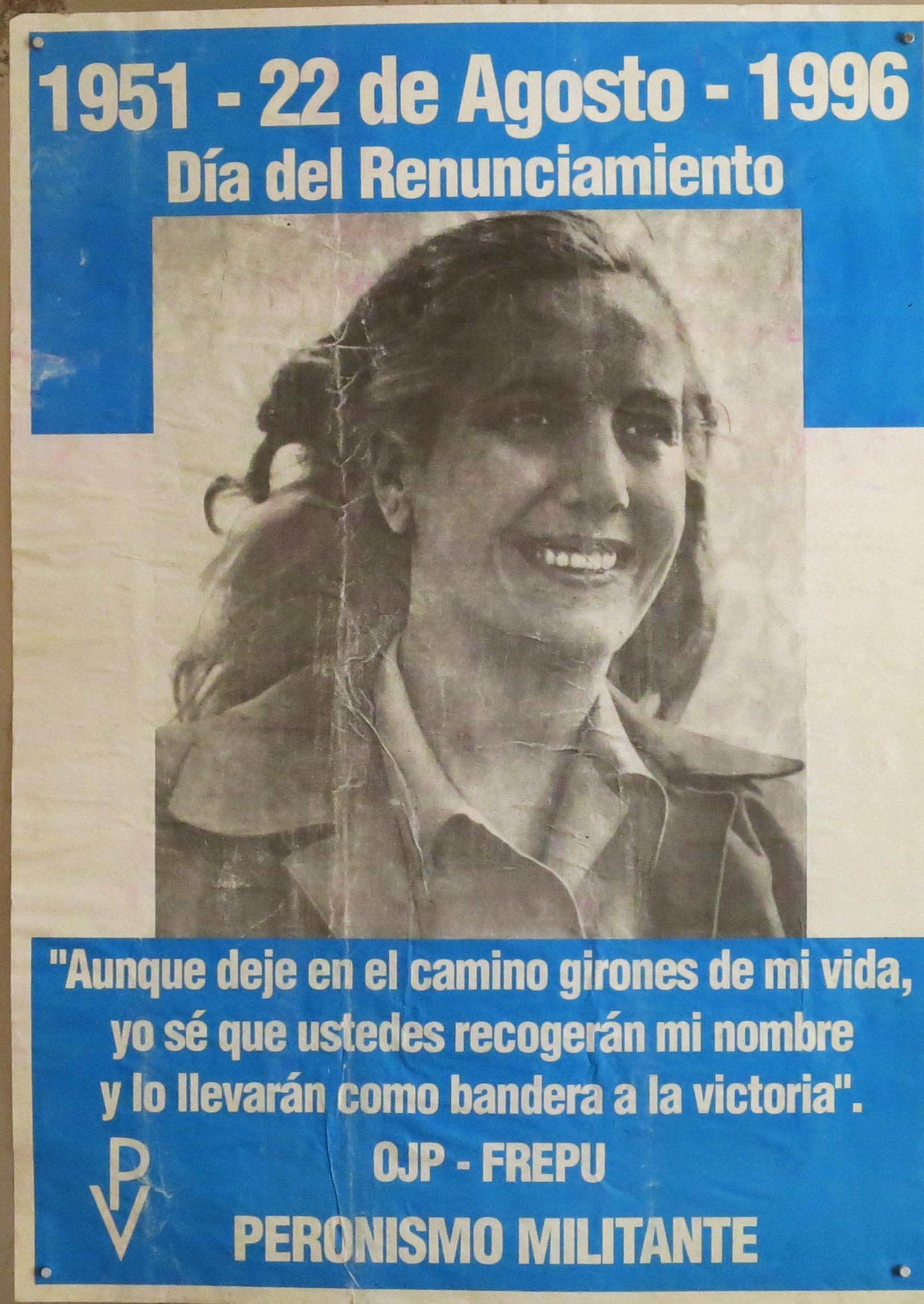 Afiche en grises y celeste, con foto de Evita de pelo suelto. Se lee: "1951- 22 de agosto - 1996.