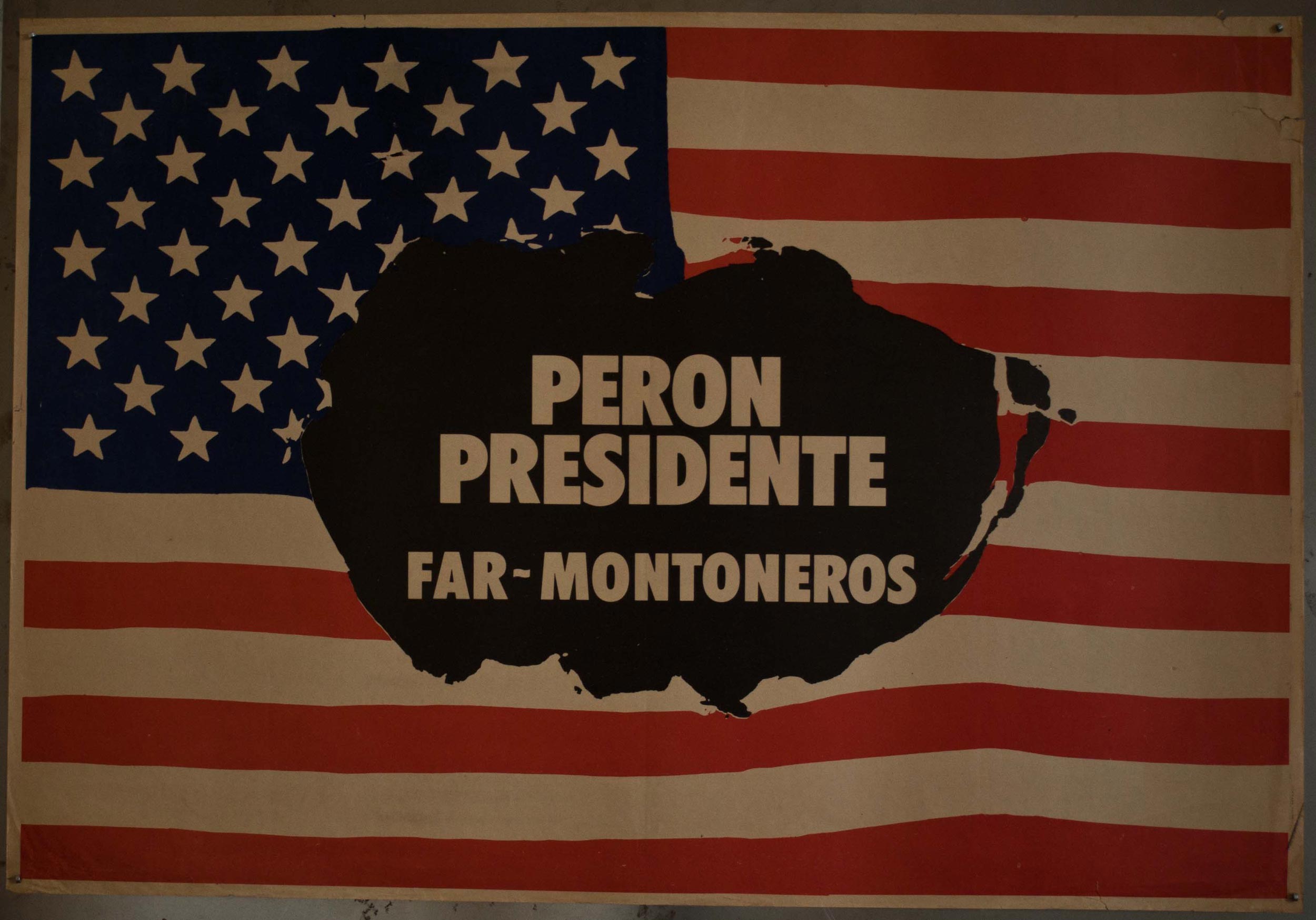 Mancha negra sobre bandera norteamericana. Se lee: "Perón presidente. FAR-Montoneros".
