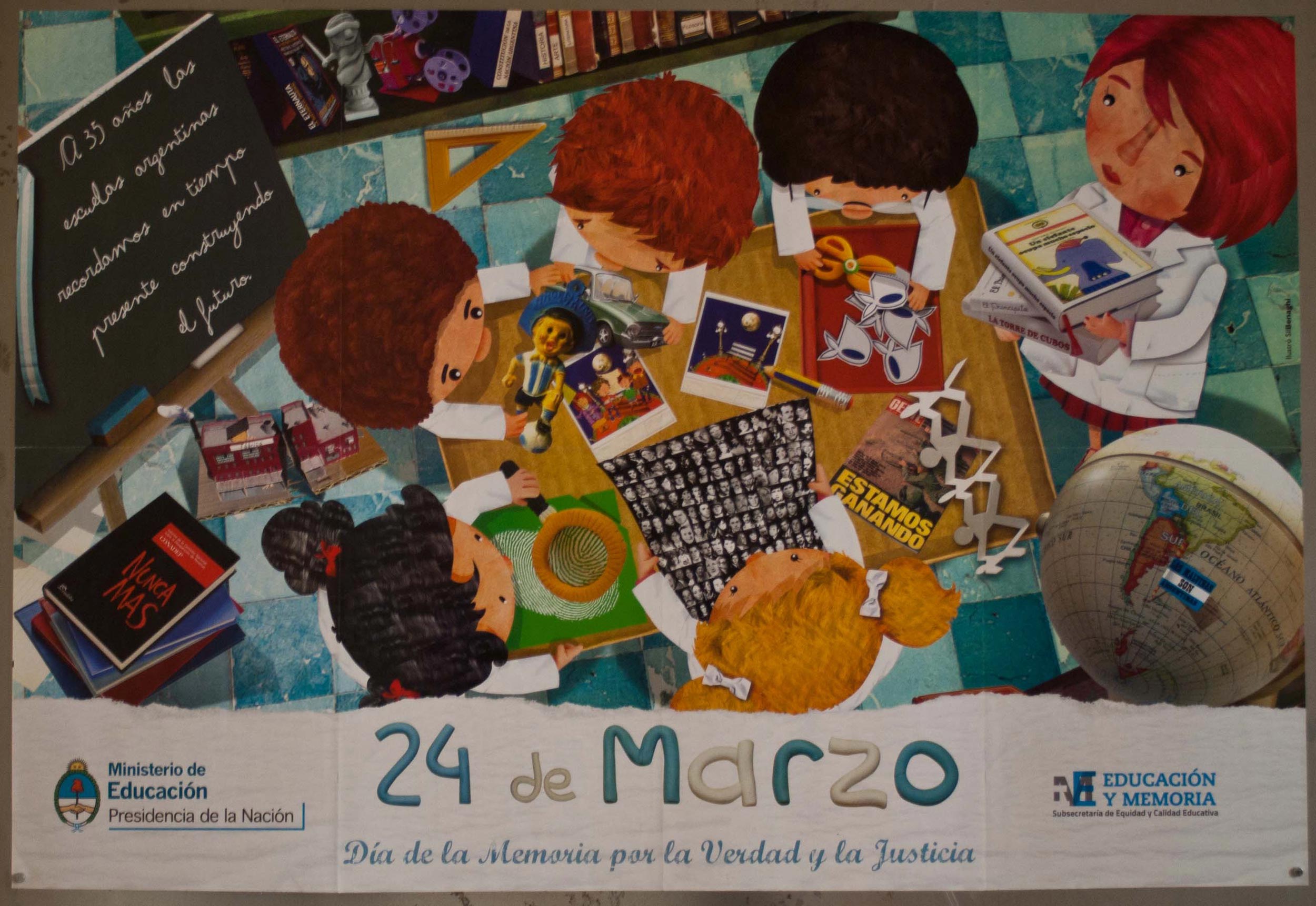 Afiche impreso por el Ministerio de Educación para enviar a las escuelas, en conmemoración a los 35 años de último golpe de estado. Impreso a color con una ilustración de Sil Benaghi en la que se ve a unos niños con guardapolvo desde arriba trabajando en una mesa con material sobre el tema. Se lee: "A 35 años del golpe las escuelas argentinas recordamos en tiempo presente construyendo el futuro".