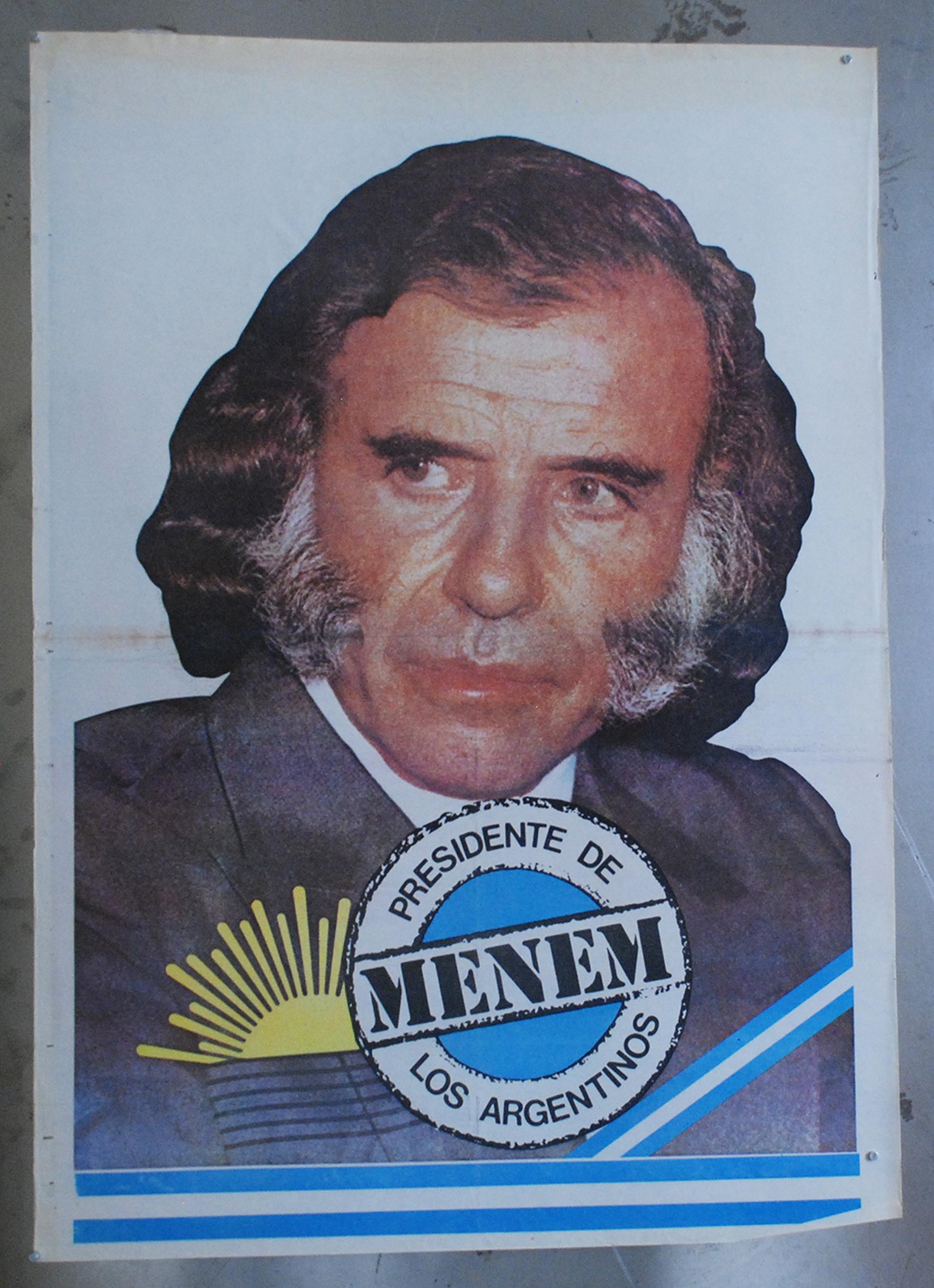 Afiche impreso a color con la cara de Carlos Saúl Menem. Se lee, con forma de sello: "Menem presidente de los argentinos".