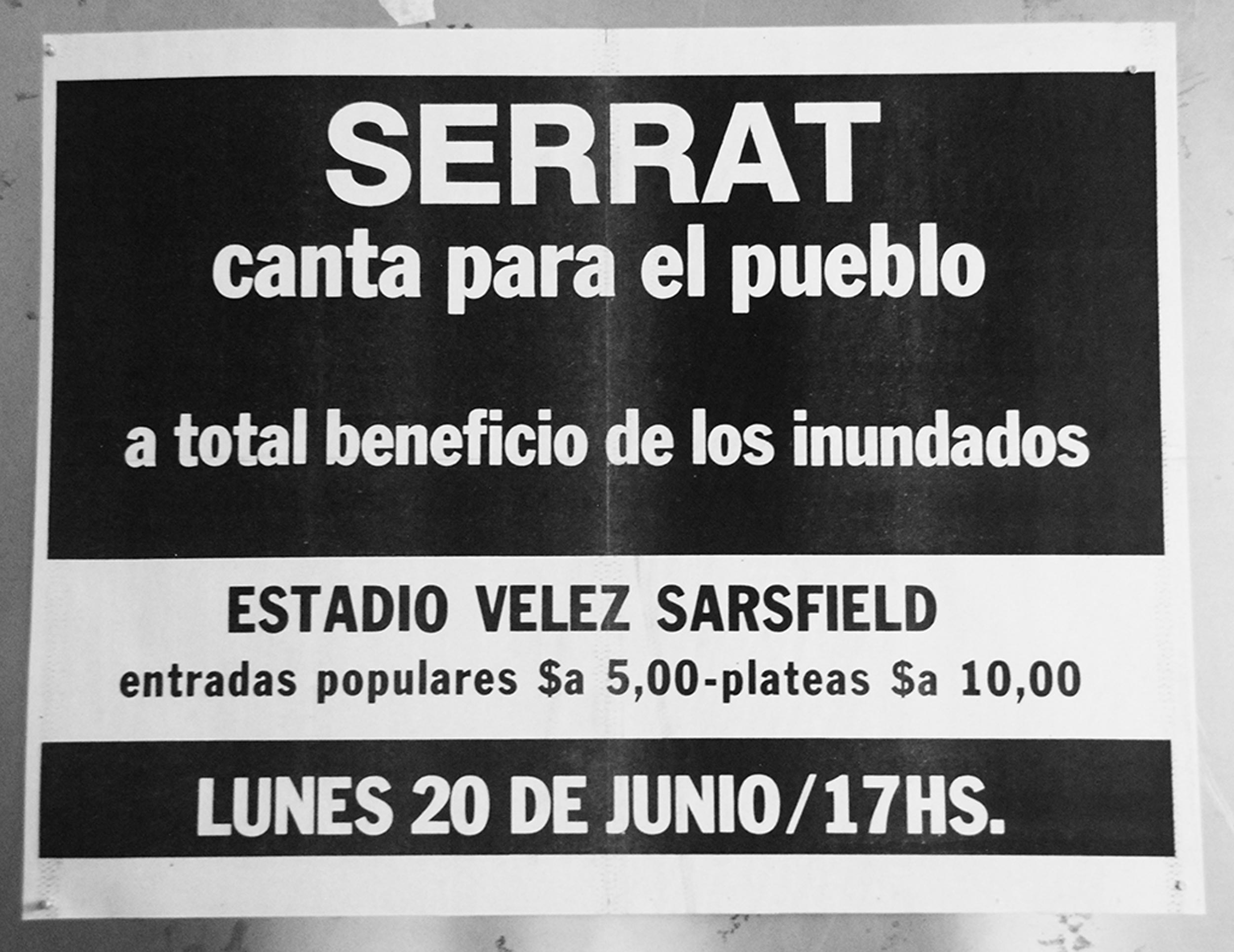 Afiche impreso en negro sobre fondo blanco, sin imagen, ni firma. Se lee: "Serrat canta para el pueblo a total beneficio de los inundados. Estadio Velez Sarsfield. Entradas populares $a 5,00- plateas $a 10,00. Lunes 20 de junio/17 hs.".