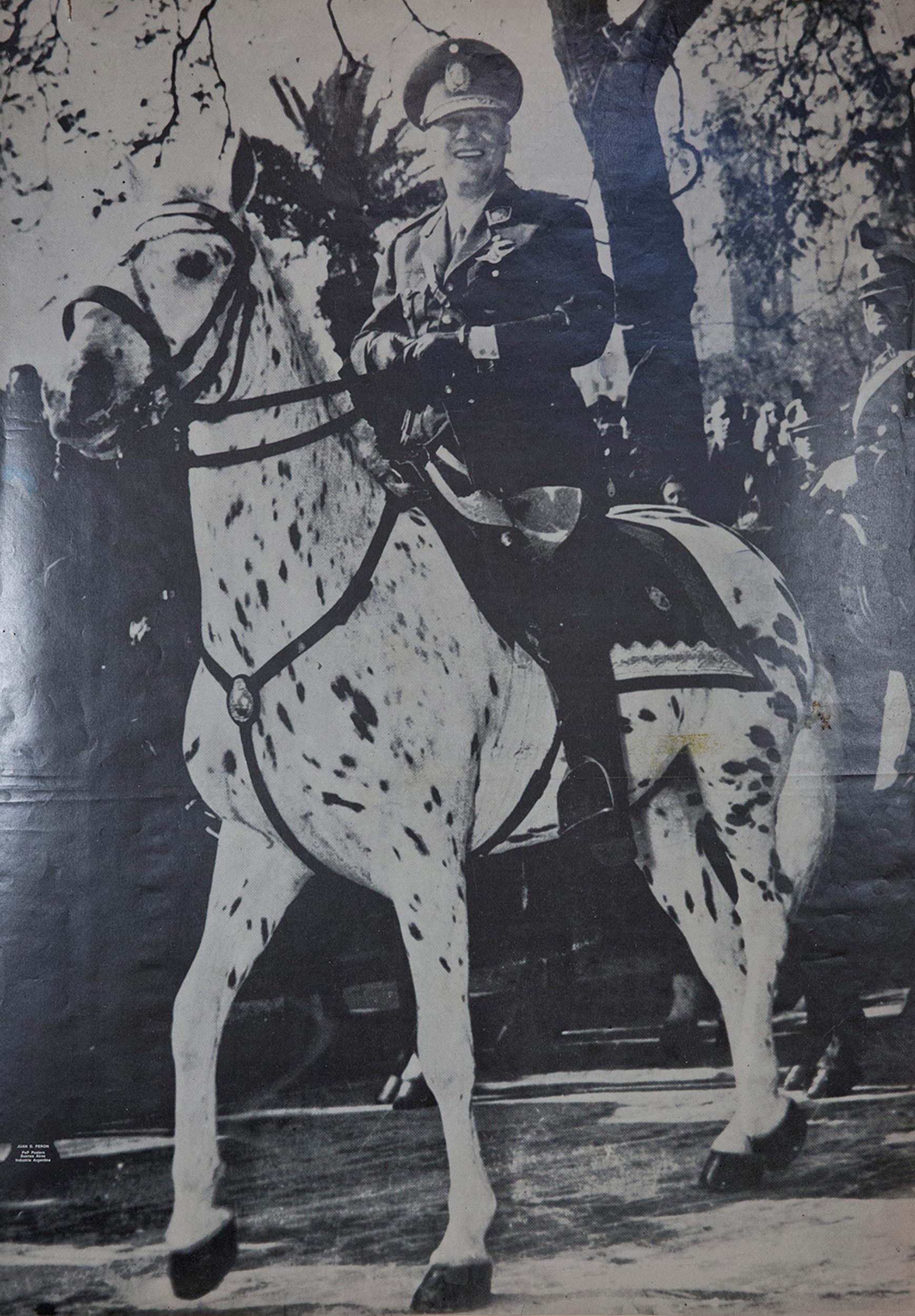 Afiche con imagen de Juan Domingo Perón sobre caballo blanco, vestido de militar, sin inscripción.