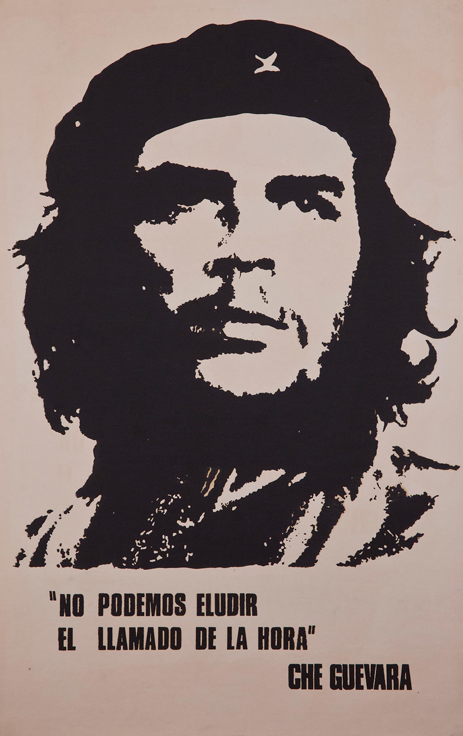 Afiche impreso en negro sobre fondo blanco con rostro de Ernesto Che Guevara. Se lee: "'No podemos eludir el llamado de la hora' Che Guevara".
