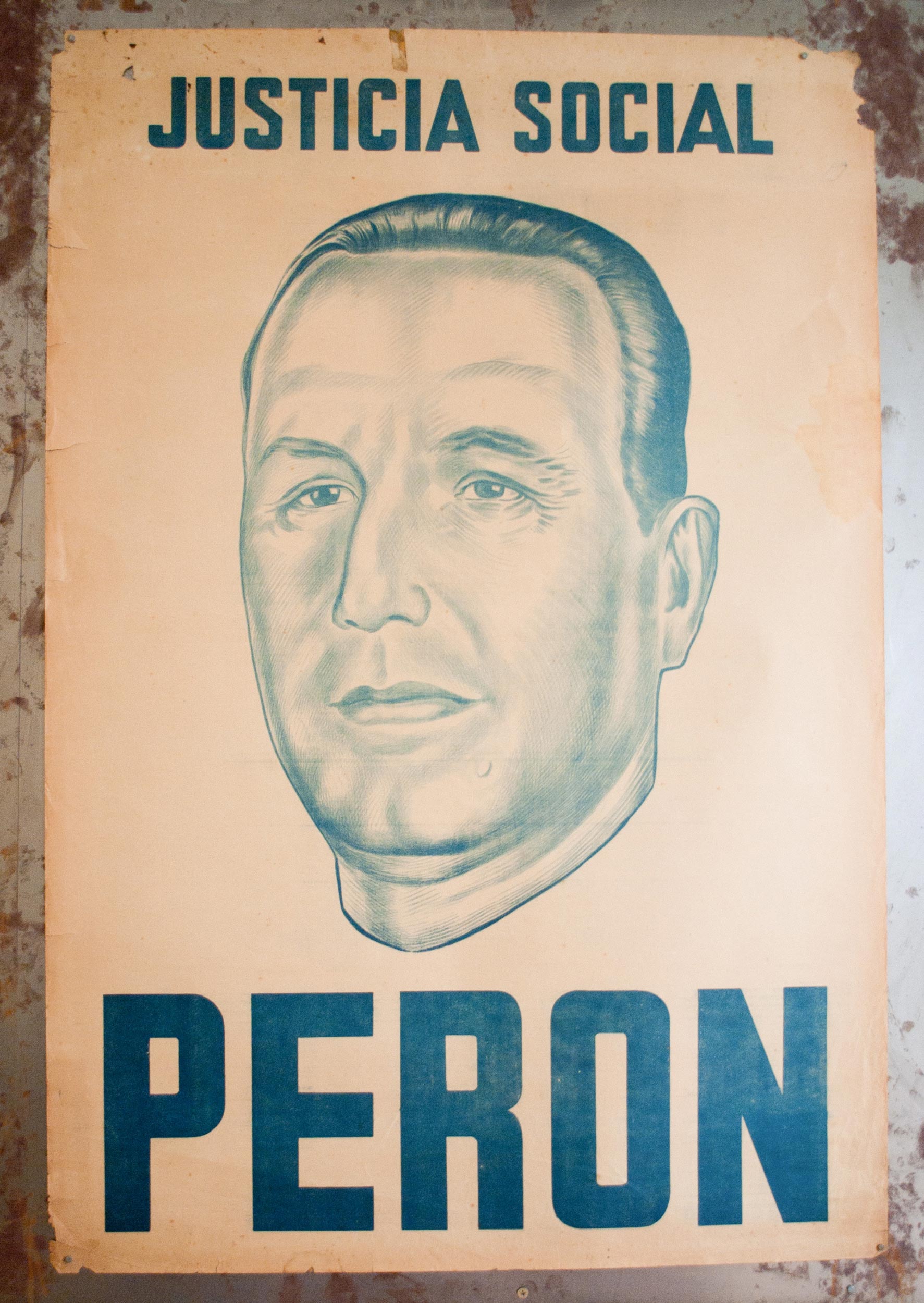 Impreso en azul sobre fondo blanco. En el centro se observa la cara de Juan Domingo Perón realizada en dibujo, tipo lápiz. Se lee: "Justicia social. PERON".