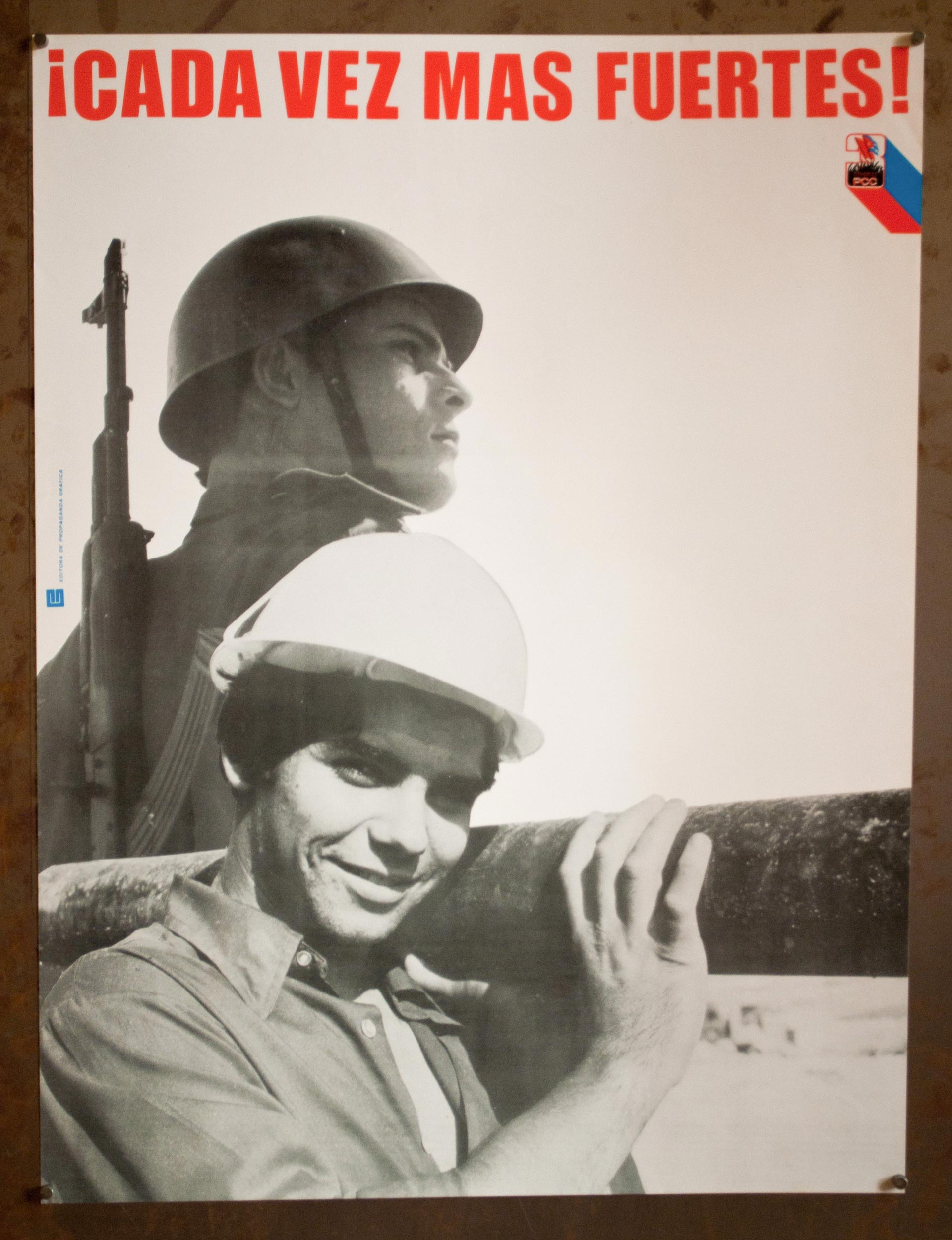 Afiche impreso en grises y rojo con foto de un soldado y un trabajador. Sólo se lee: "¡Cada vez más fuertes!".