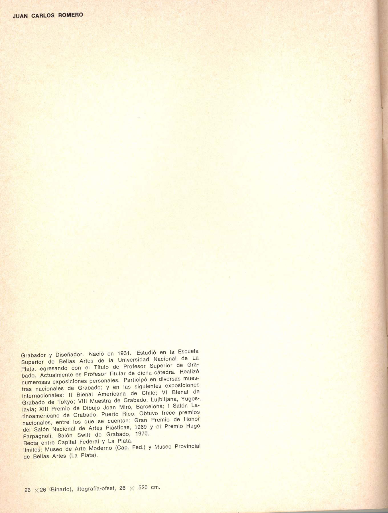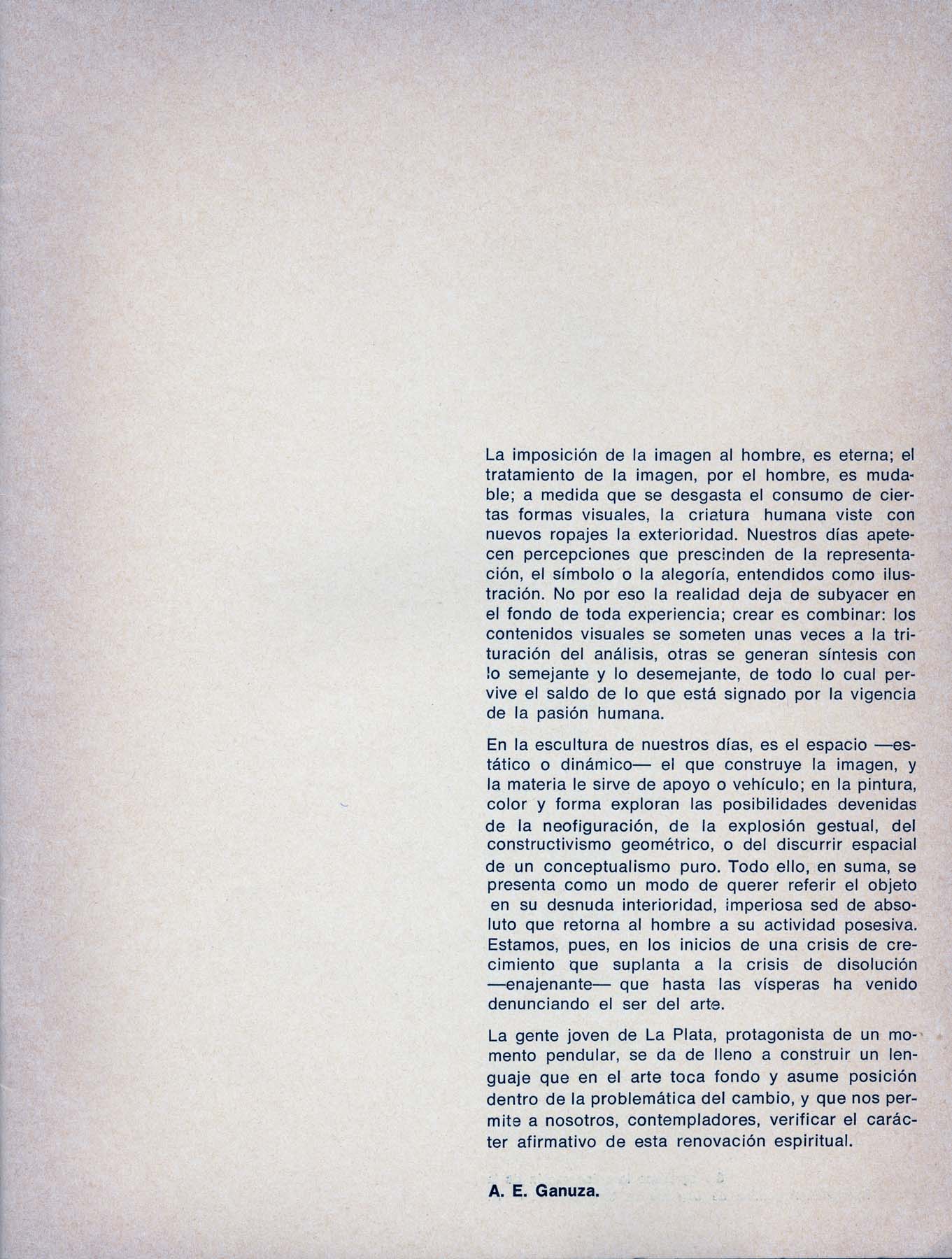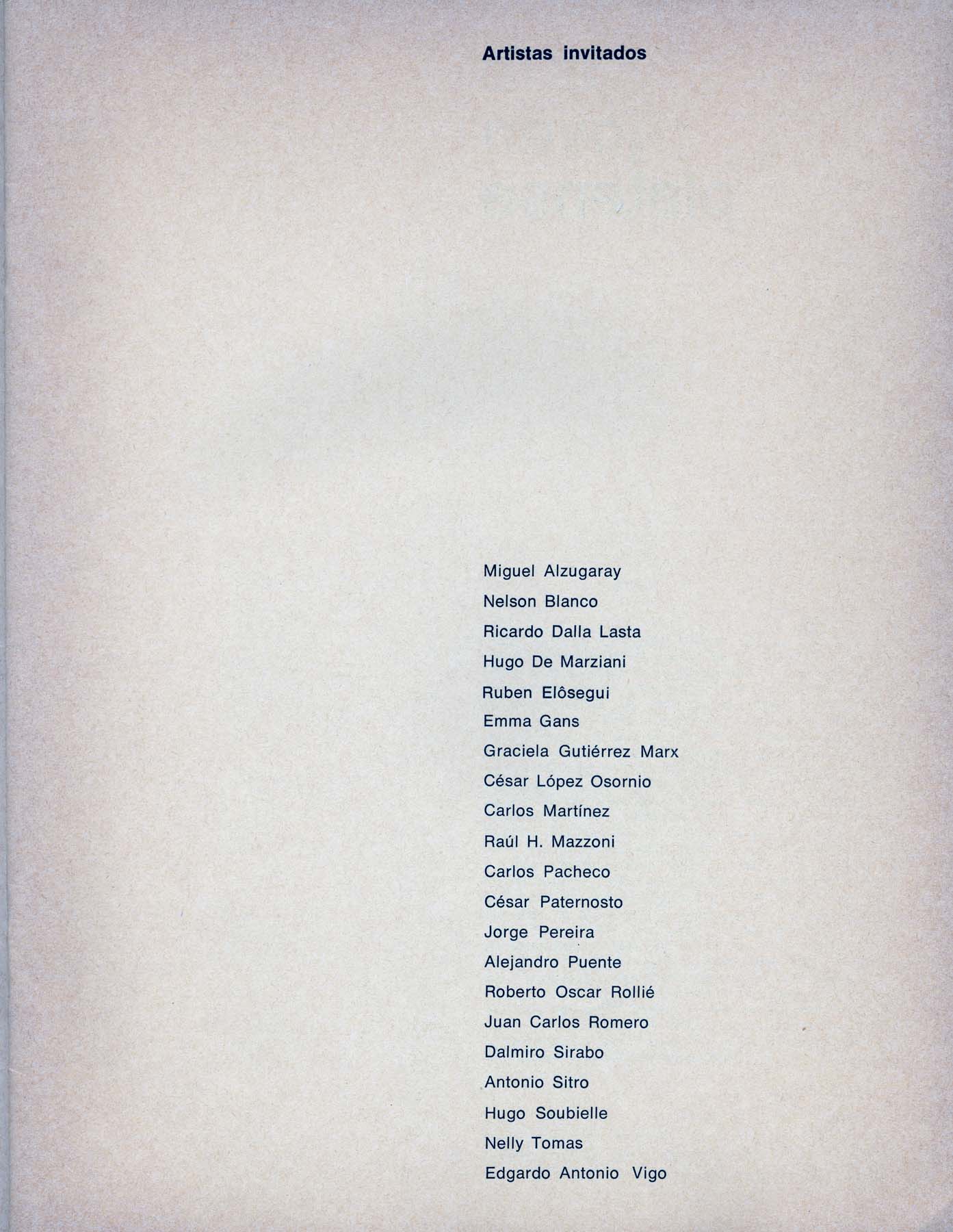 Exposición colectiva: Alzogaray; Blanco; Dalla Lasta; De Marziani, Elôzegui; Ganz; Gutierrez Marx; López Osornio;Martinez; Mazzoni; Pacheco, Paternosto; Pereira; Puente; Rollié; Sirabo; Sitro; Soubielle; Tomas, Vigo Texto de A. E Ganuza. Nota: hay uno en estante.