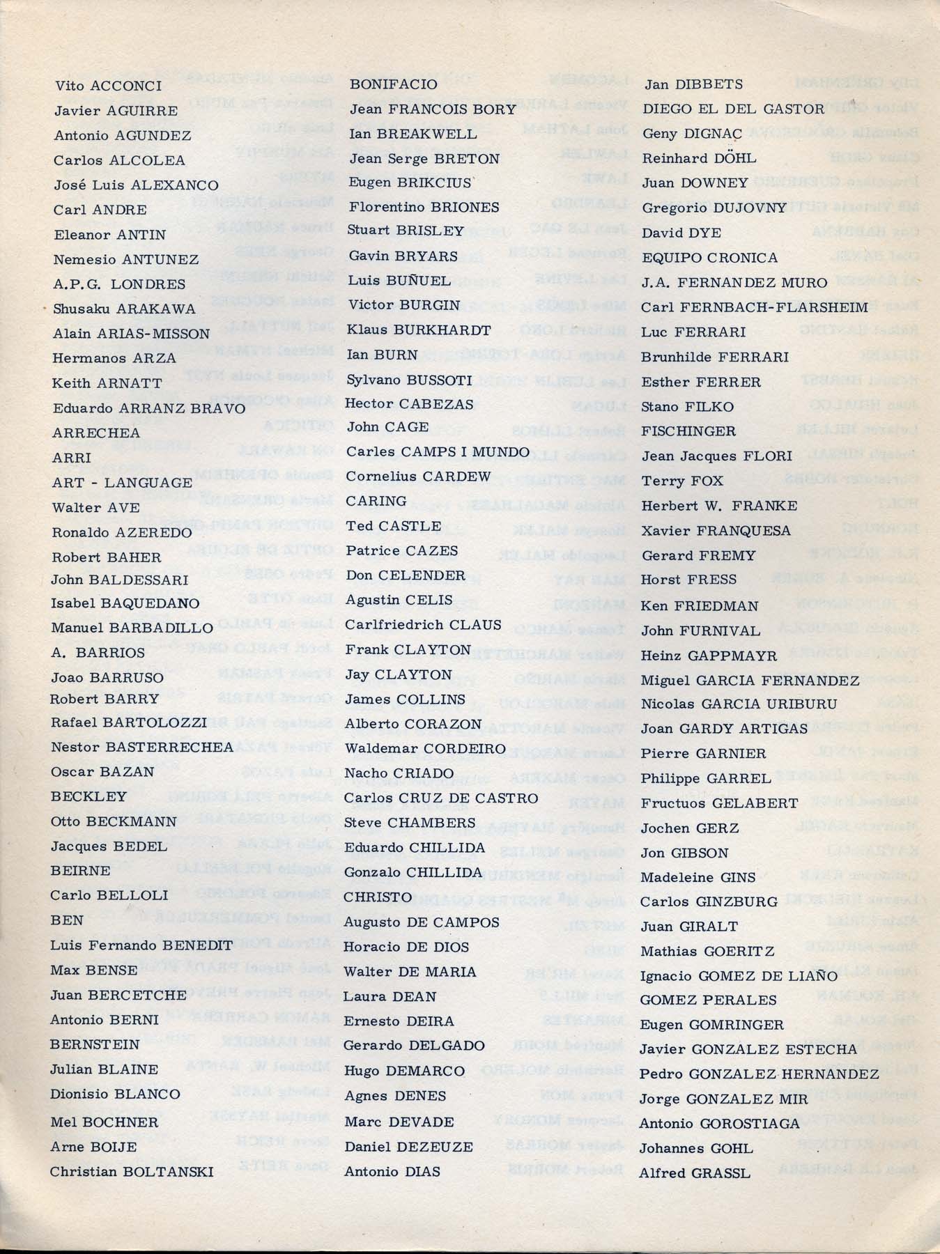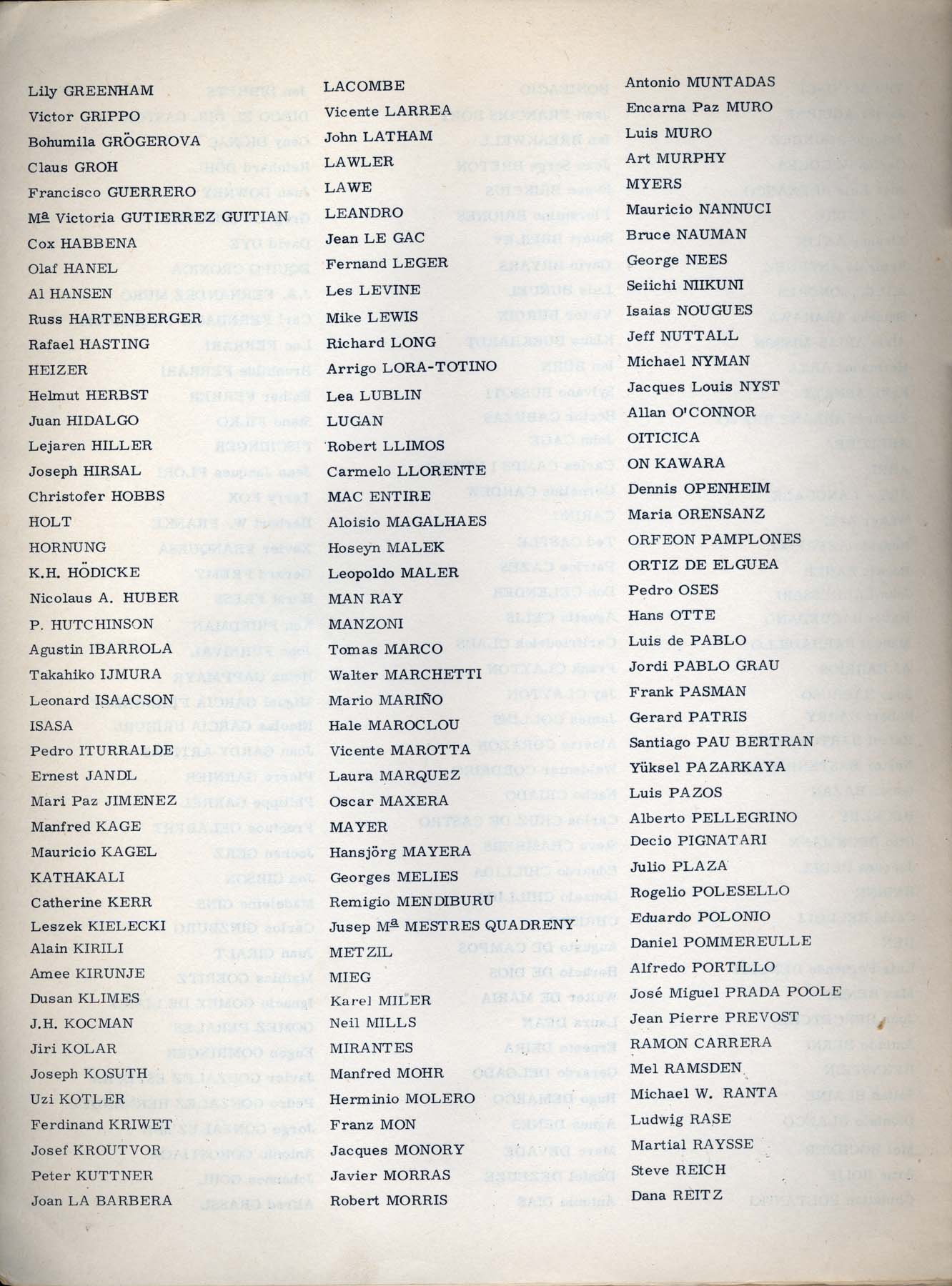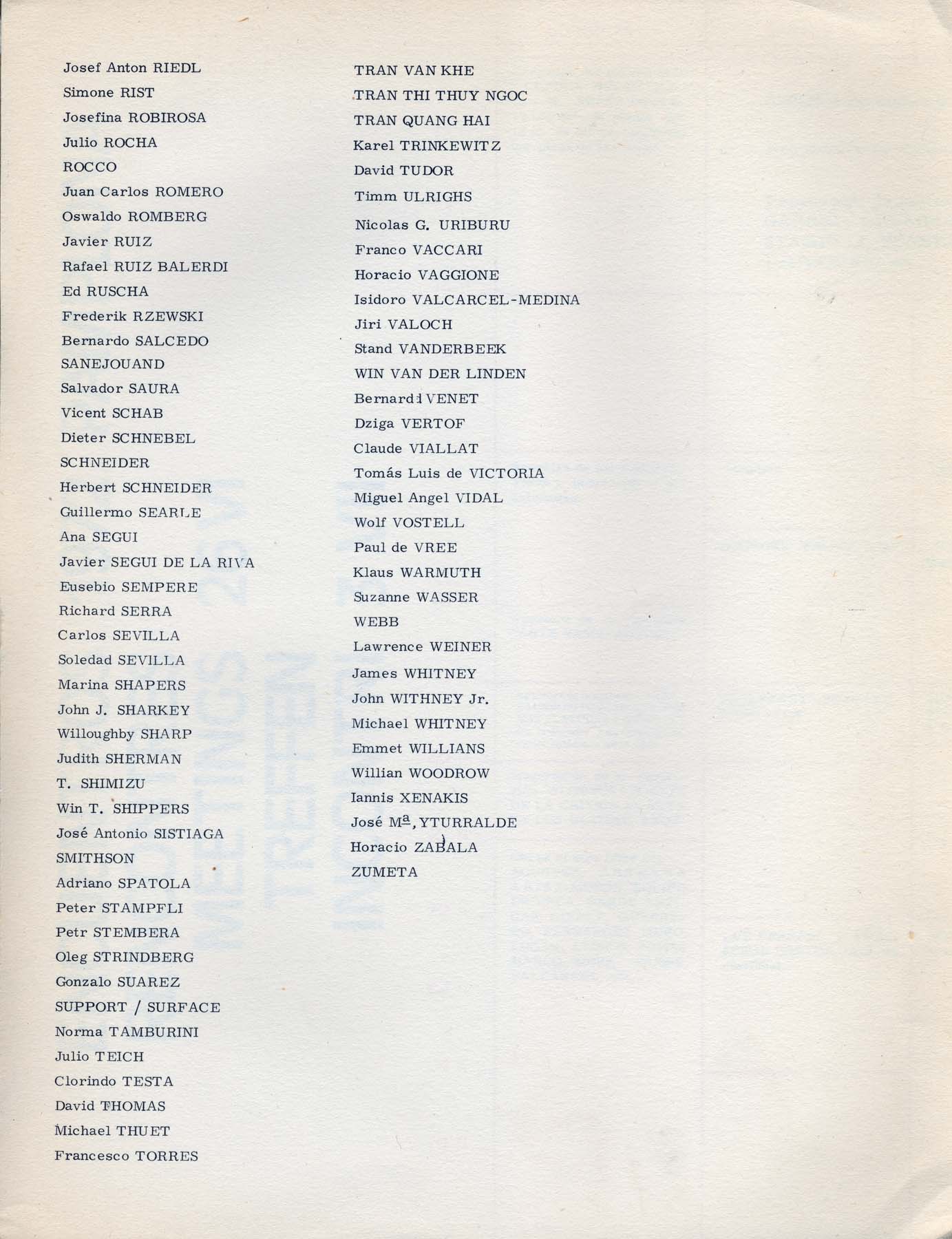 Participan, entre otros: Alexanco, Arrechea, Barbadillo, Baher, Beckmann, Benedit, Briones, Berni, Cage, Cordera, De Dios, Deira, G. Delgado, Demarco, Dujovny, Garcia, Gomez de Liaño, Gomez Perlaes, Gonzalez, Gutierrez Guitan, Giller, Isaacson, Mac Entyre, Mariño, Mestres, Quadreny, Nogues, O'Connor, Pasman, Polesello, Romberg, Robirosa, Searle, A. Segui, Segui de la Riva, Sempre, C. Sevilla,. S. Sevilla, Tamburini, Vaggione, Vanderbekk, Vidal, Xenakis, Yturralde.
