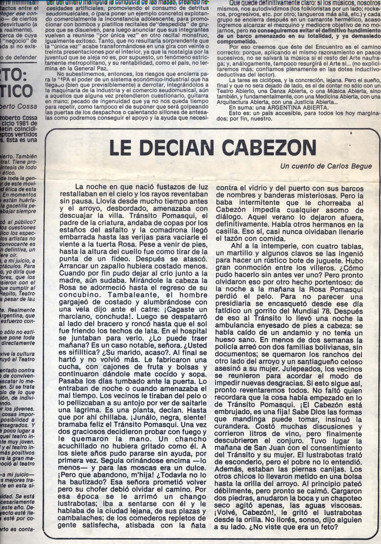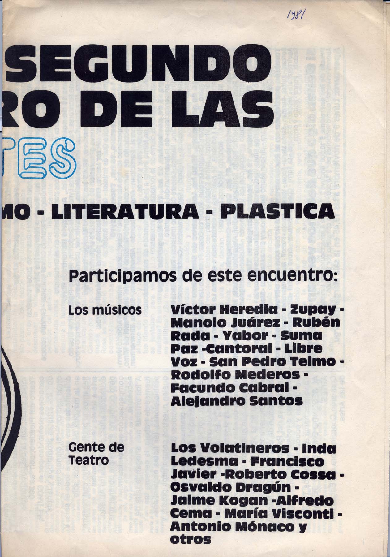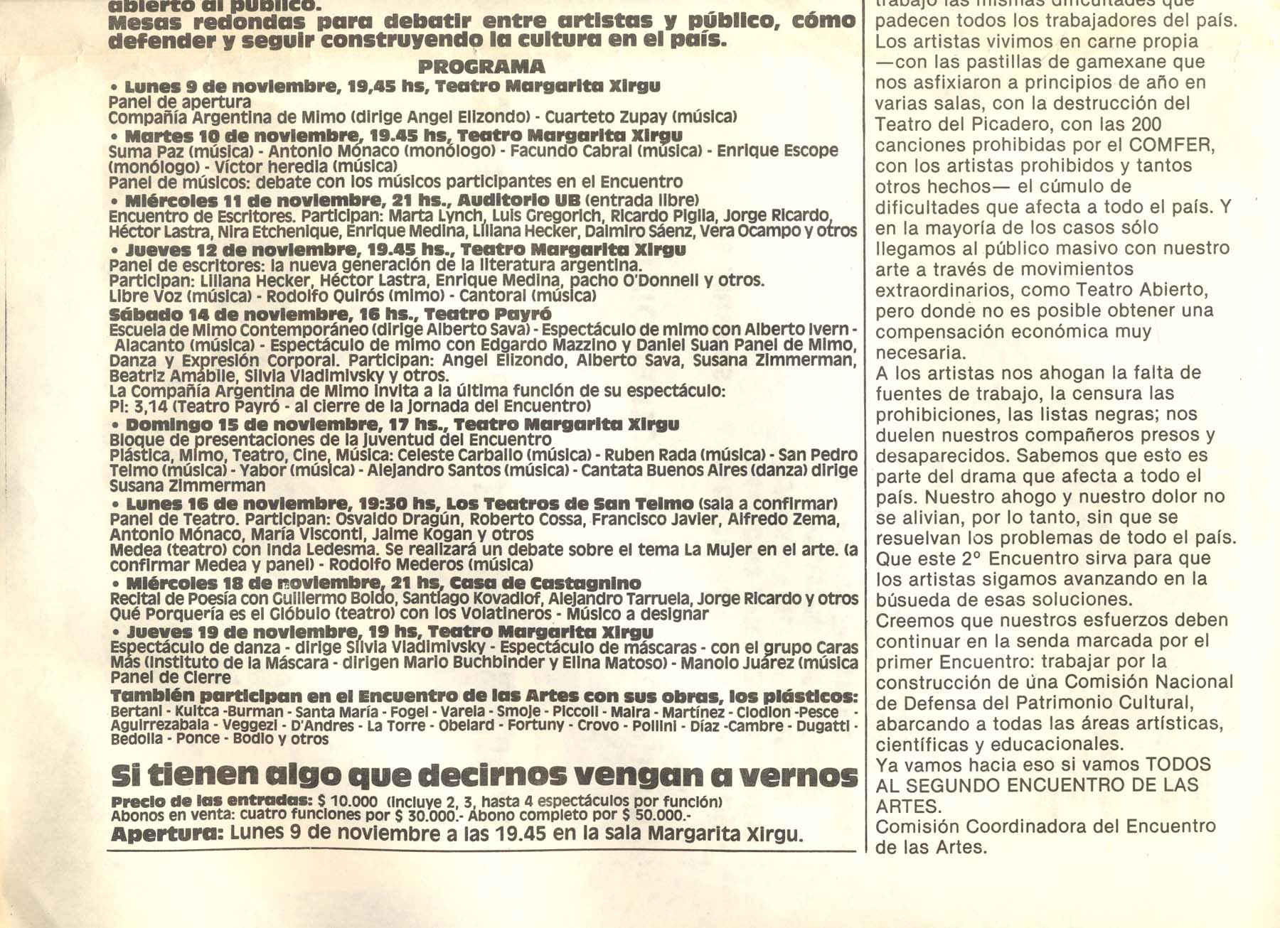 Textos de Horario Aragona, Carlos Bege, Roberto Cossa. Participan: Victor Heredia, Zupay, Manolo Juárez, Rubén Rada, Suma Paz, Cantoral, San pedro Telmo, Facundo Cabral, Los Volatinero, Inda Ledesma, Roberto Cossa, Osvaldo Dragún, Kogan, María Visconti, Compañía Argentina de Mimo (Dirige Ángel Elizondo), Susana Zímerman, Beatríz Amábile, Gregorich, Tarruela, Asís, Lastra, Goldar, Vera Campo, Piglia, Marta Lynch, Pacho Odónel, Dalmiro Sáenz.
