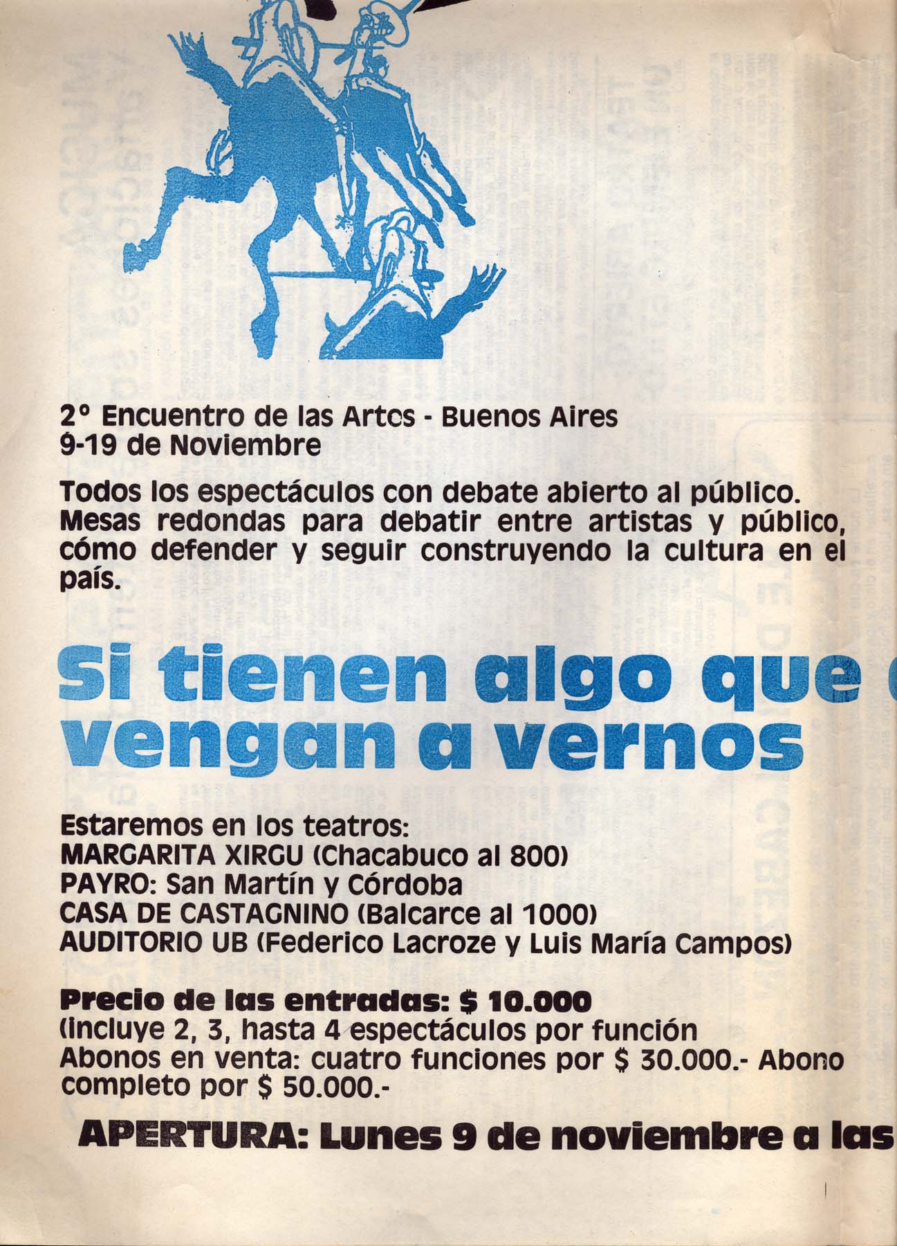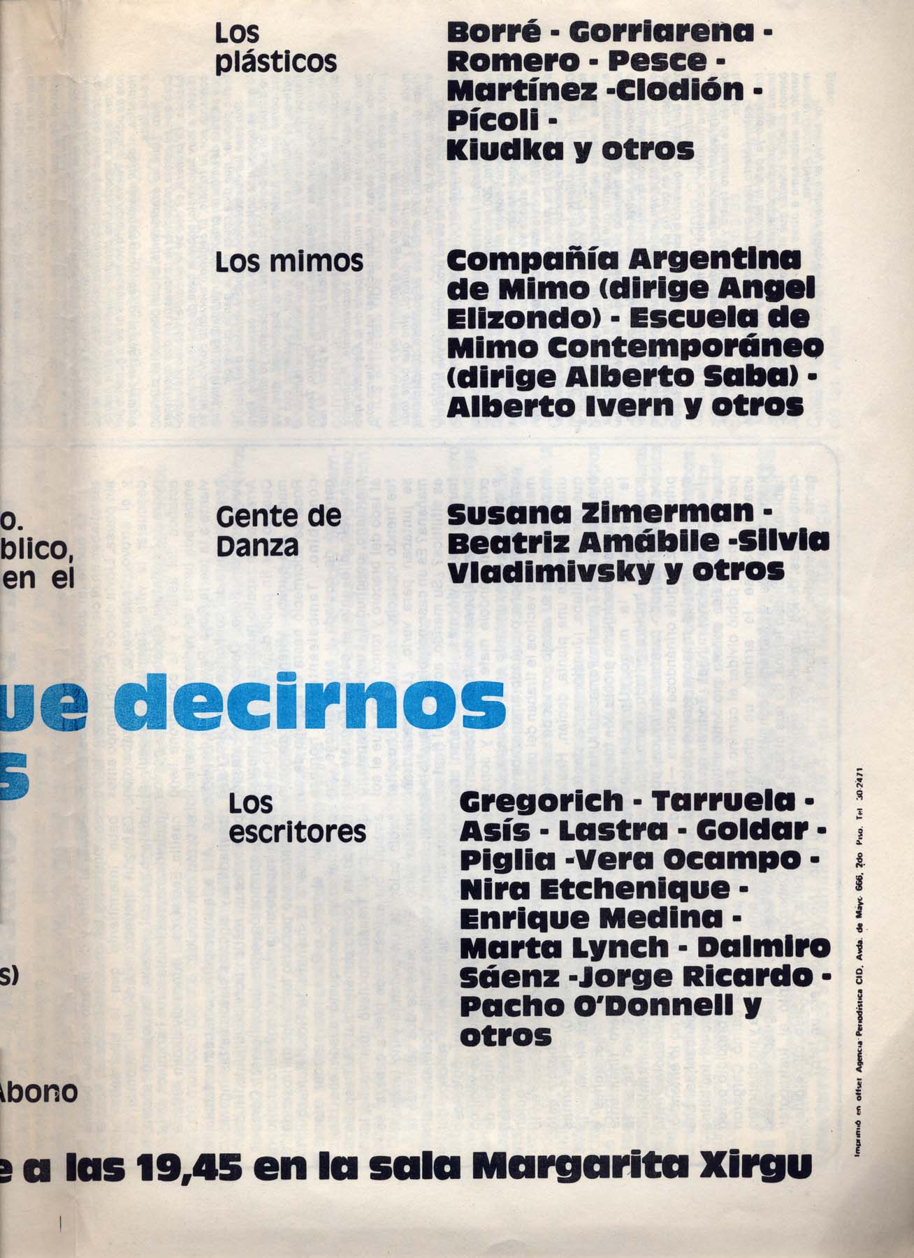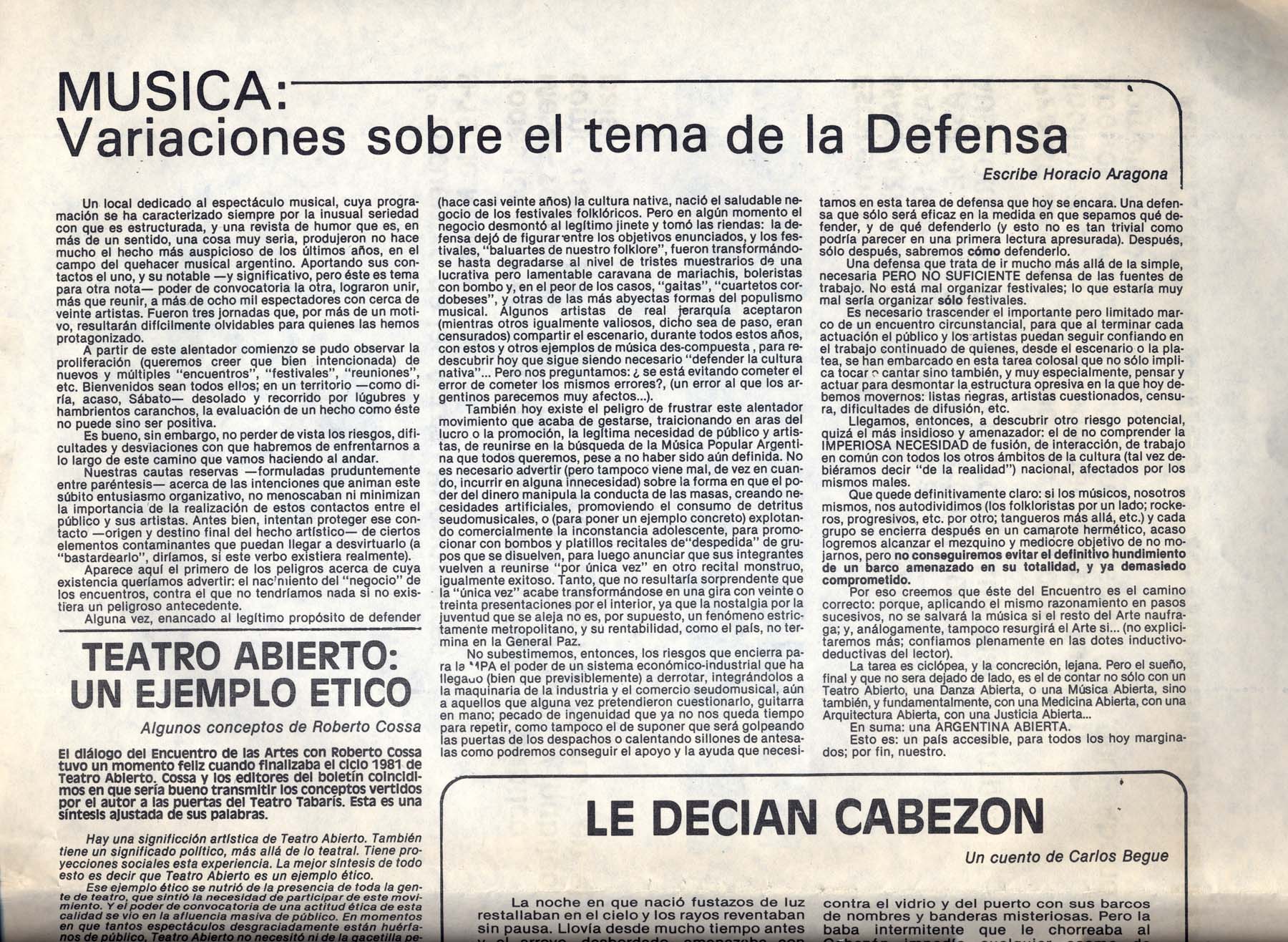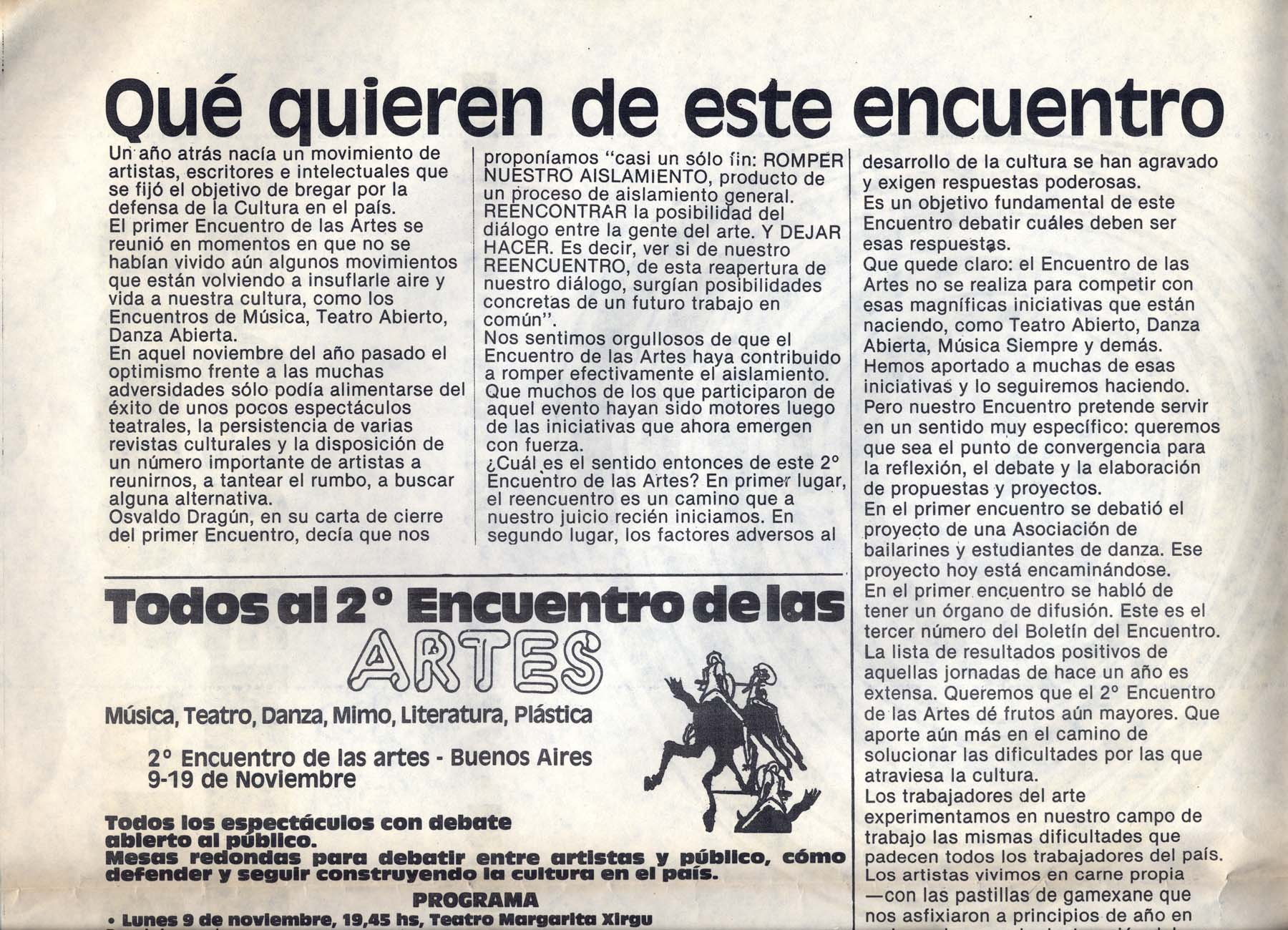 Textos de Horario Aragona, Carlos Bege, Roberto Cossa. Participan: Victor Heredia, Zupay, Manolo Juárez, Rubén Rada, Suma Paz, Cantoral, San pedro Telmo, Facundo Cabral, Los Volatinero, Inda Ledesma, Roberto Cossa, Osvaldo Dragún, Kogan, María Visconti, Compañía Argentina de Mimo (Dirige Ángel Elizondo), Susana Zímerman, Beatríz Amábile, Gregorich, Tarruela, Asís, Lastra, Goldar, Vera Campo, Piglia, Marta Lynch, Pacho Odónel, Dalmiro Sáenz.