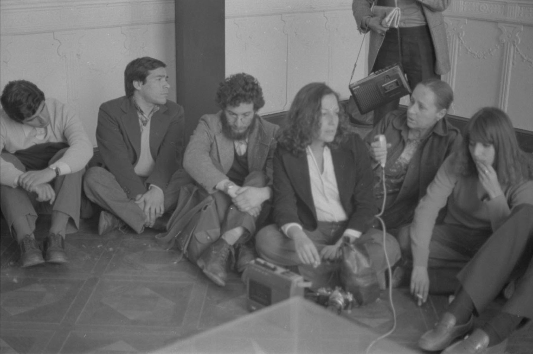 Grupo de personas conversando sobre la acción, donde la artista Luz Donoso tiene el micrófono
