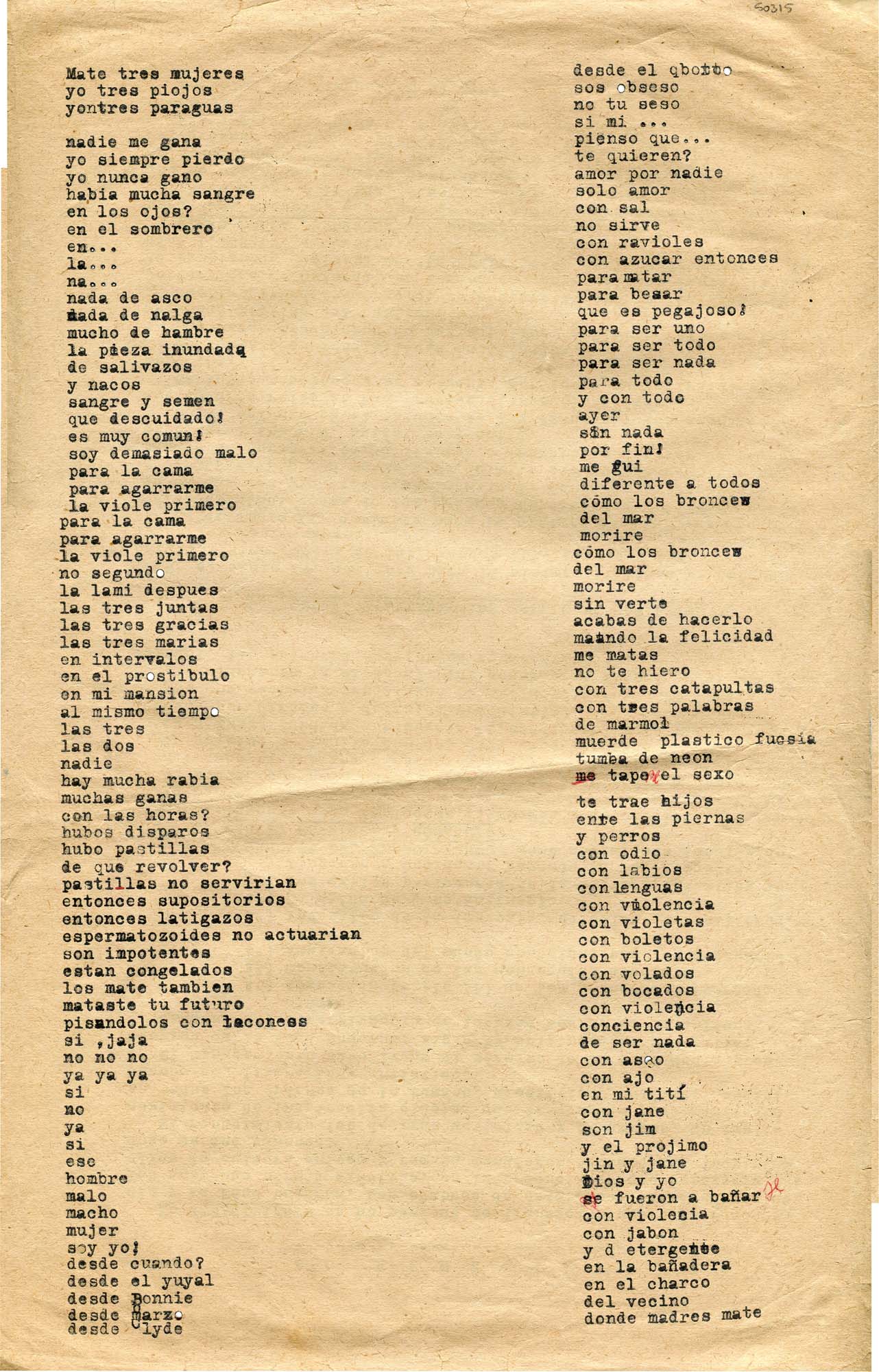 En los textos de Cira Moscarda y Alfredo Seppe suelen presentarse referencias a Bonnie y Clyde, fugitivos por antonomasia, romantizados por la industria cinematográfica (y aun antes) y, también, por su escritura. Asimismo, las alusiones al semen son frecuentes. Se trata de un poema con períodos cortos que aluden en clave irónica a la muerte. Esta aproximación humorada a lo luctuoso está asociada con imágenes eróticas, marcadas por homologías entre fluidos como sangre y semen. La figura de Bonnie y Clyde aparece aquí, vinculada con los nombres Jim y Jane (referencia desconocida), quizás como una expresión de complicidad entre sujetos percibidos como marginales: motivo frecuente en los textos de Seppe y Moscarda.