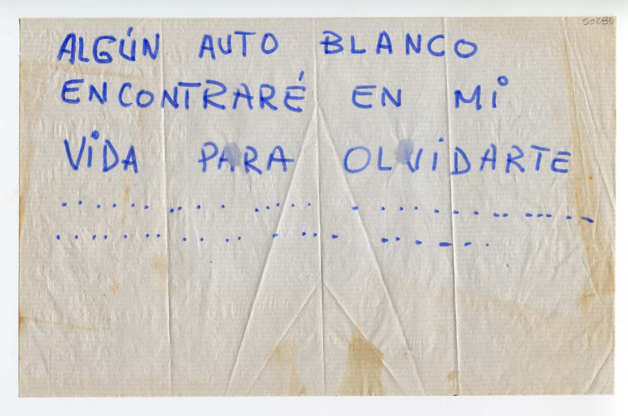 El texto no tiene firma. Con frecuencia, aparecen en el archivo fragmentos poéticos o de carácter humorados, unas veces empleados como insumos de otros textos; otras, que funcionan de manera autónoma casi como esloganes. La metáfora ontológica, mediante la antropomorfización del automóvil, o metonimia de objeto poseído, se vuelve una forma de eufemismo a través del que se elude nombrar a un sujeto acaso vago, o inexistente.