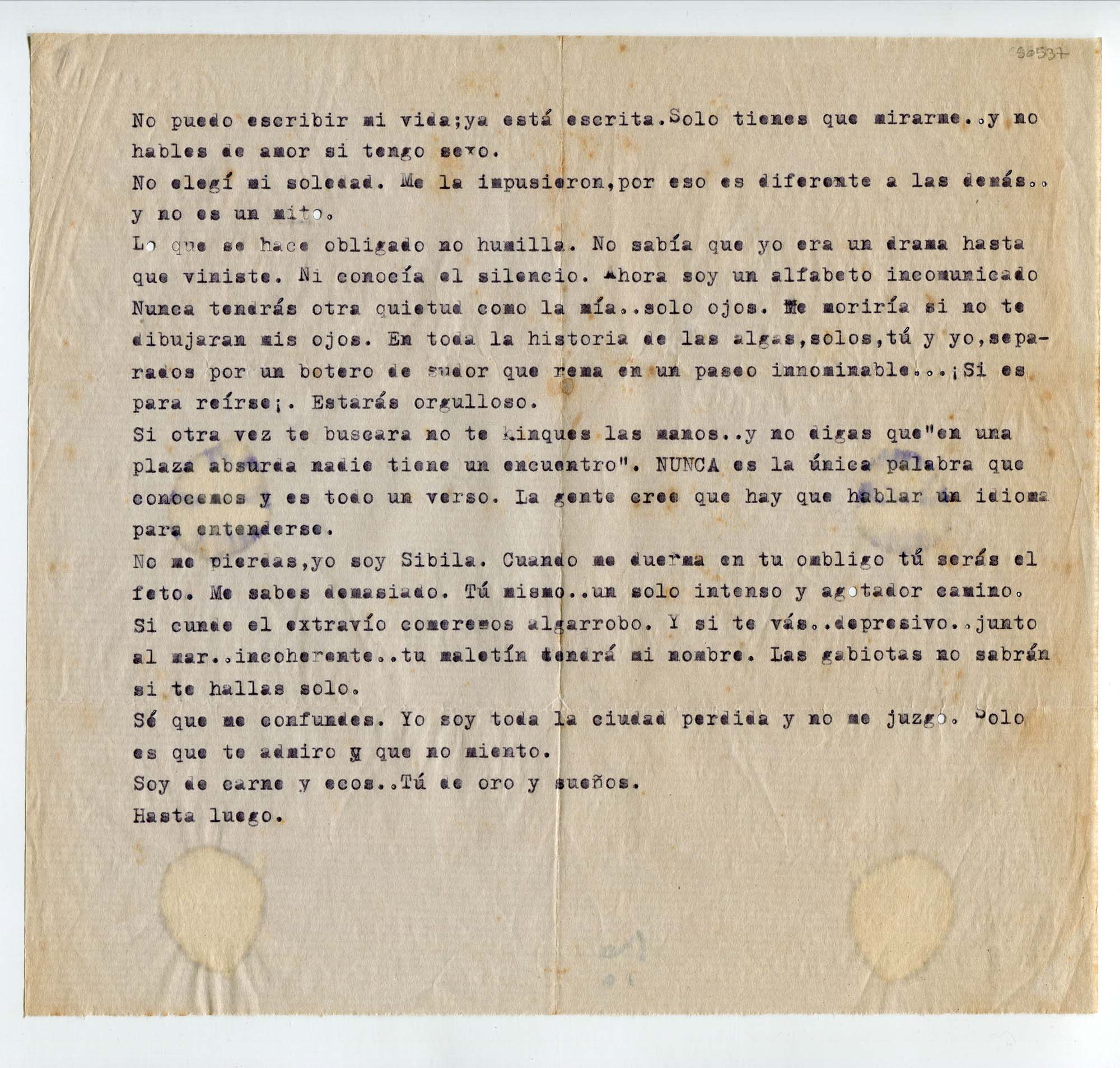 Se trata de un texto en clave autoreferencial y reflexiva en el que Moscarda se nombra a sí misma Sibila (esto es que puede predecir el futuro). Hay un trabajo con la figura de la apóstrofe, que consiste en dirigirse a una segunda persona que no se nombra. Se presume que se trataría de Seppe.