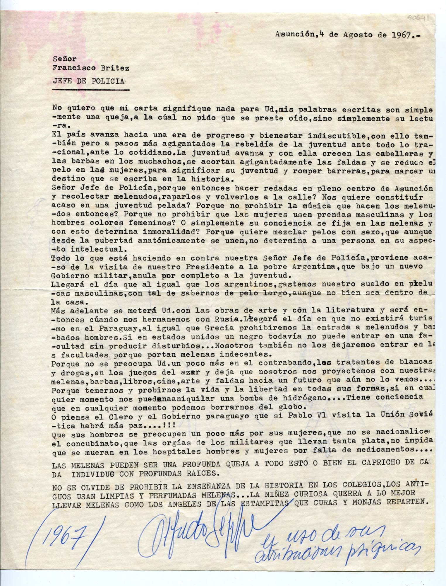 Carta de Alfredo Seppe dirigida al jefe de Policía Francisco Brítez. La misiva es un reclamo contra las redadas para detener a hombres de pelo largo y barba. Quizás se trate de un ejercicio catártico y humorado; no hay constancia de que la carta haya sido enviada.
