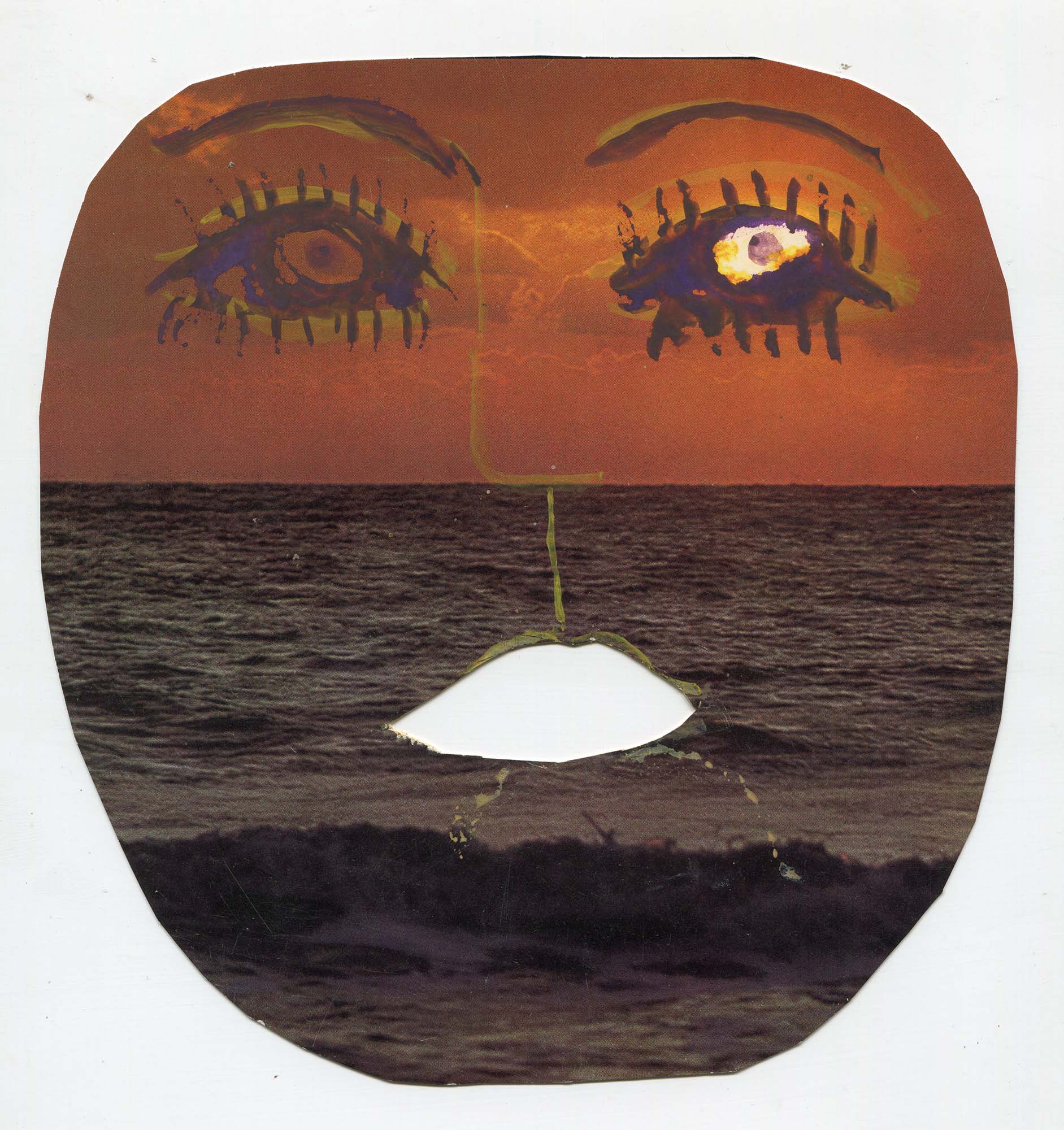Máscara de papel confeccionada a partir de un recorte, posiblemente de revista, que presenta un atardecer en horizonte marítimo, con olas rompiéndose. La máscara, pensada quizás no como objeto de uso, sino como representación, exhibe una abertura en la boca, no así en los ojos, que se encuentran pintados, aprovechando, en uno de los lados, la circunferencia ofrecida por el sol. Esta abertura en la boca, sea quizás el indicador tanto de un emisor como de un dador de las funciones orales, cegado deliberadamente, o cuyo campo de visión se encuentra diluido en la fantasía del paisaje idílico; o, por el contrario, puede conducir a pensar en un receptor, igualmente cegado en su identidad por la fantasía. La máscara es, asimismo, una imagen recurrente en los discursos de Alfredo Seppe y de Cira Moscarda, quienes no sólo se inventan alteridades idílicas, míticas y épicas, sino que apelan a la posibilidad de trascender los límites de la propia identidad a partir de artefactos que operen exteriores a ellos mismos.