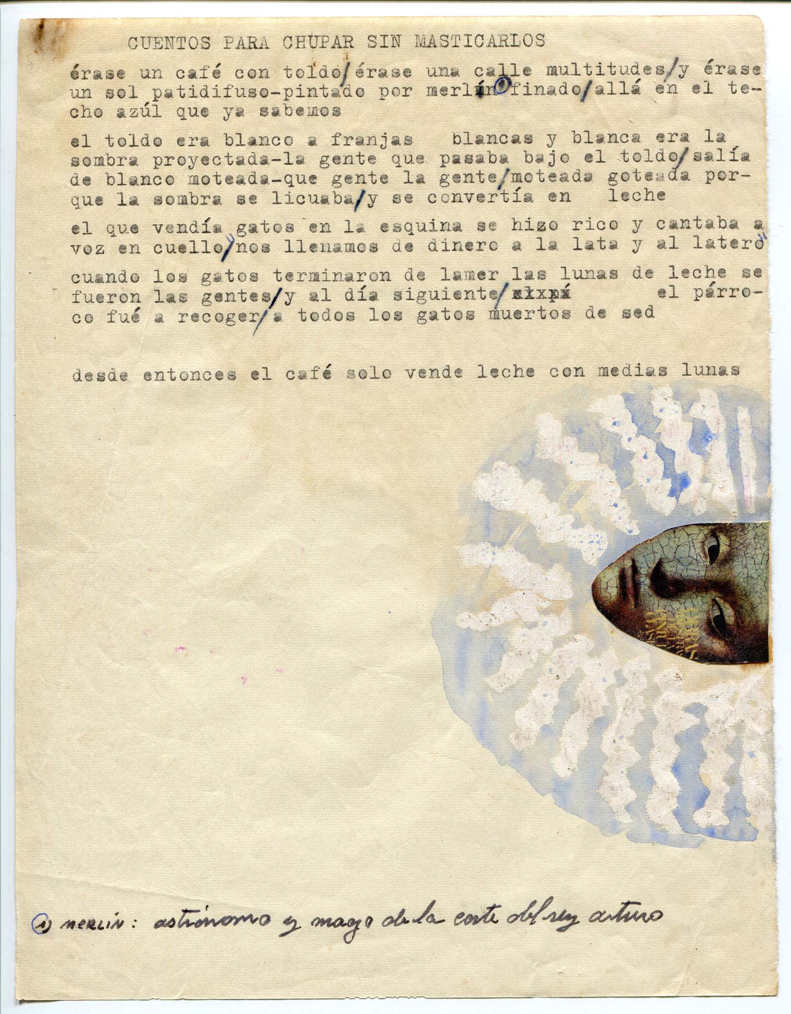 Texto en registro lúdico bastante frecuente en el archivo. Por la letra de una aclaración en el papel se atribuye el texto a Cira Moscarda, aunque la voz común esté presente también en este texto. La ilustración está compuesta por una imagen recortada y pegada, se trata de un rostro, el que es intervenido con pintura y cloro.