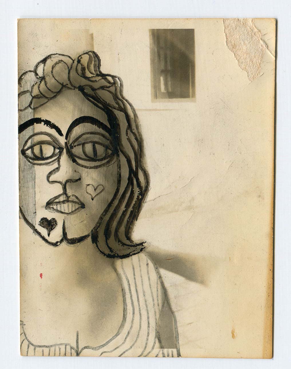 Retrado de Alfredo Seppe, en su casa de Caacupé, a los 11 años, según consta al dorso de la fotografía. La figura está intervenida con un dibujo que trasviste a Seppe niño, con elementos de la Dama de Corazones. Unos senos femeninos se insinuan en el escote, mientras los ojos presentan pupilas verticales, felinas.