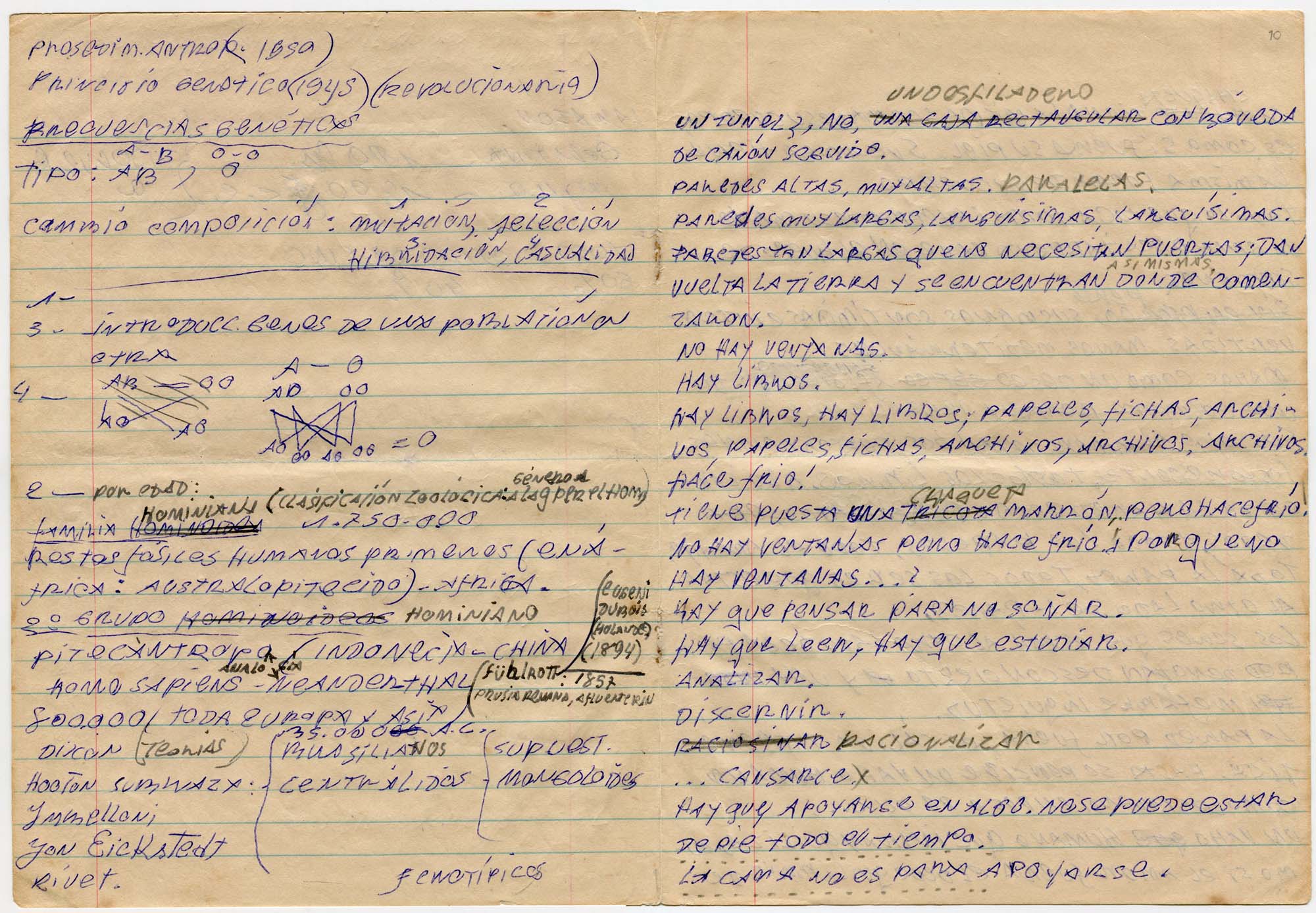 Las hojas de un cuaderno escolar presentan fragmentos de un texto retratístico, en el que se enumeran las cualidades de una persona, su atractivo, a partir de estrategias cuasi metonímicas, con acento en la ropa (una camisa, una chaqueta al cuerpo). Alternan este discurso apuntes sobre genética e historia de la evolución humana, así como notas con porcentajes de insumos como gelatina, yeso y zinc, posiblemente de algunas clases a las que haya asisitido Seppe. Al final del discurso lírico hay una impresión de desencanto y aprisionamiento, en la enumeración de elementos de cierre, circunscripción, vigilancia, carencia (sobre todo intelectual) y limitación, y una invocación a buscar alguna escapatoria o algún reposo de esta condición.