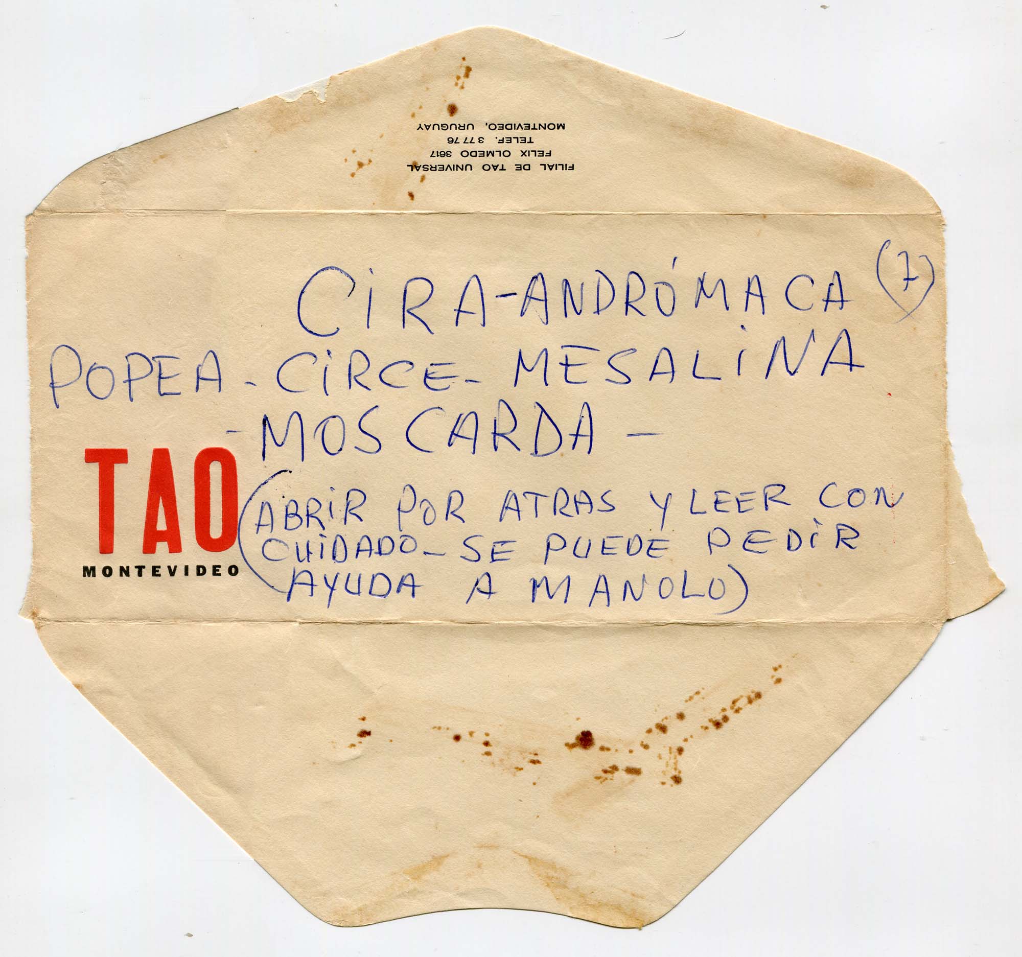 En la cubierta del sobre se nombra a Cira Moscarda mediante adposiciones de nombres de personajes griegos: mujeres míticas y épicas imaginadas, en cierto sentido, en relación a hombres poderosos: Adrómaca, Popea, Mesalina y Circe (esposas, amantes o enamoradas de héroes masculinos). En el sobre hay indicaciones para abrirlo con cuidado, y se orienta a Cira a pedir ayuda, eventualmente a Manolo (Prieto), amigo de ambos.