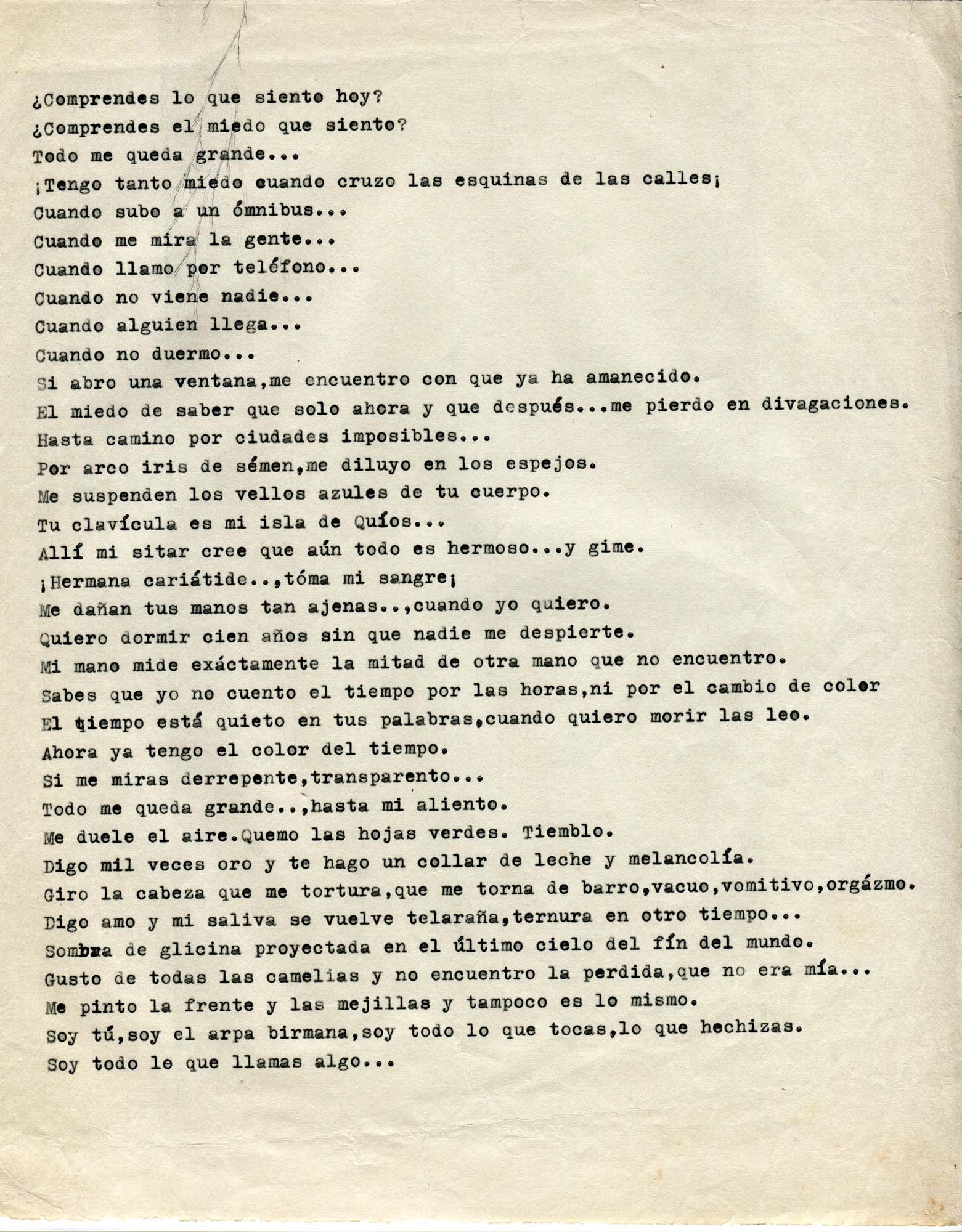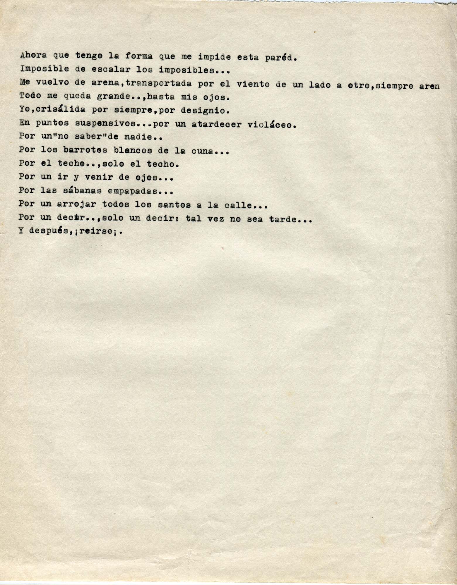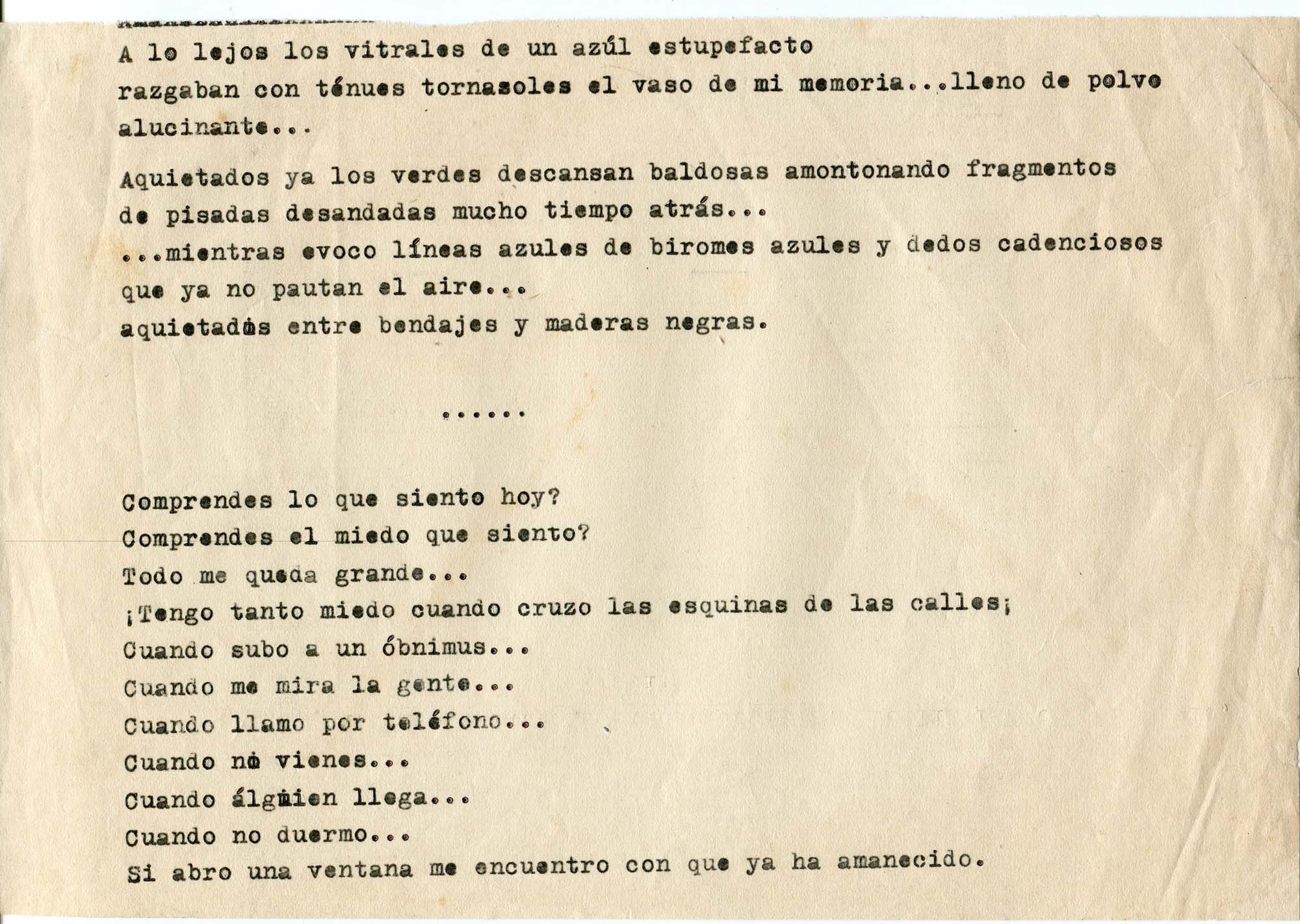En el primer documento se leen dos poemas. El primero utiliza un tono meláncolico e intimista propio de cierta escritura de Moscarda. Las imágenes evocan un paisaje de sueño, un espacio construido en el cual parece deambular. El segundo poema utiliza otro de los recursos utilizados por Moscarda, el vocativo en forma de apóstrofe a partir del cual se dirige a un otro solo para refererirse a ella misma. La aseveración: "todo me queda grande", quizá dé cuenta de la angustia que le produce cierta experiencia de la vida cotidiana. El segundo documento vuelve sobre el segundo poema del documento anterior y lo continúa. En esta segunda versión se vuelve a utilizar la apóstrofe, y queda claro que esa segunda persona a la que se refiere es Alfredo Seppe. El tercer documento podría ser la continuación del texto iniciado en el anterior, aunque se puede leer de manera independiente. Sin dudas, guarda relación ya que hay un verso que se repite: "todo me queda grande", además del tono que se continúa como si fuera un solo texto. Si bien no poseen datación, la forma de escritura podría llevarnos a pensar que fue escrito a fines de los 60.