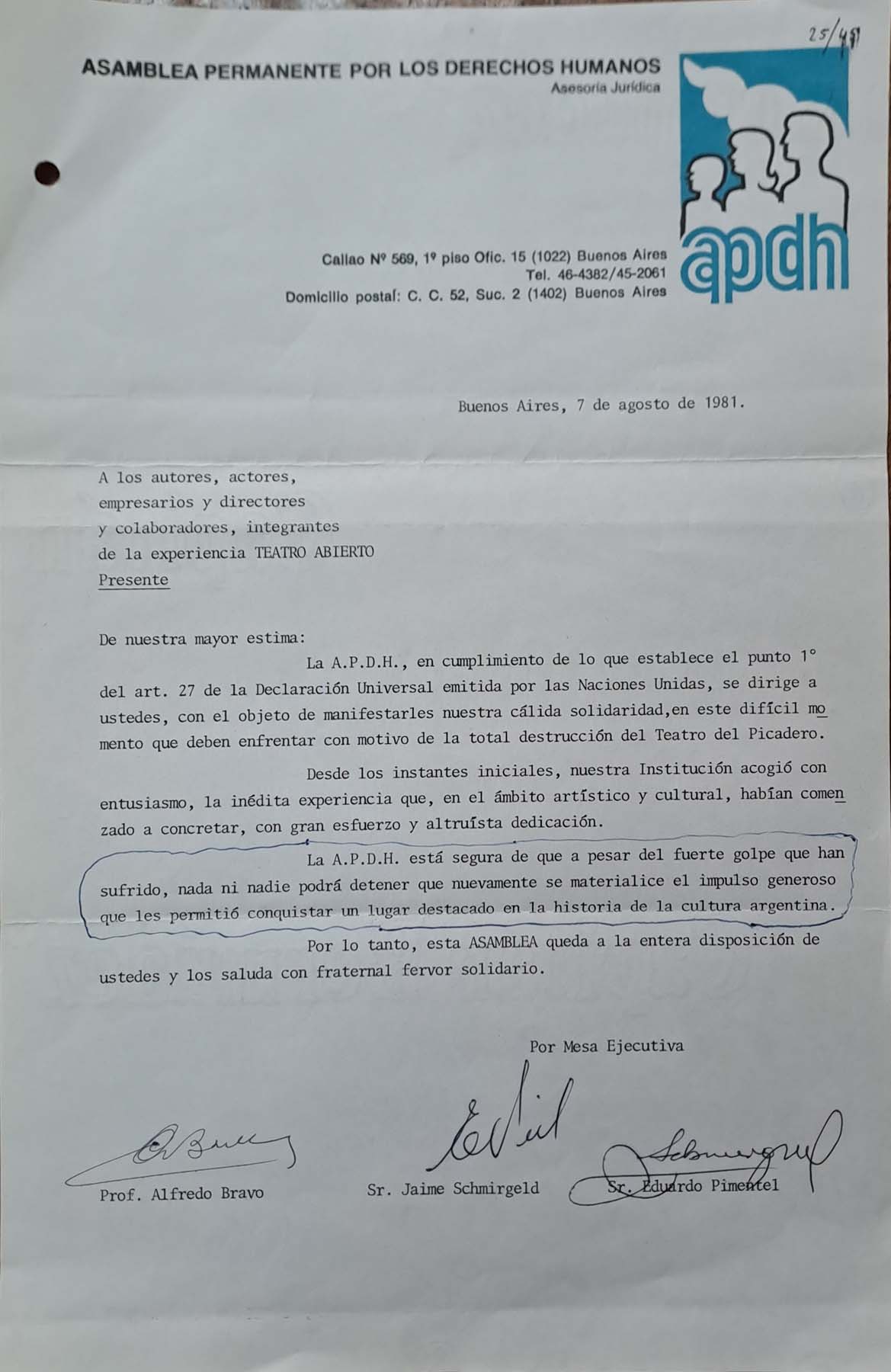La APDH, uno de los organismos de derechos humanos que protagonizó las denuncias contra la dictadura militar argentina expresa su solidaridad con Teatro Abierto luego del incendio del Teatro del Picadero. 07.08.1981.