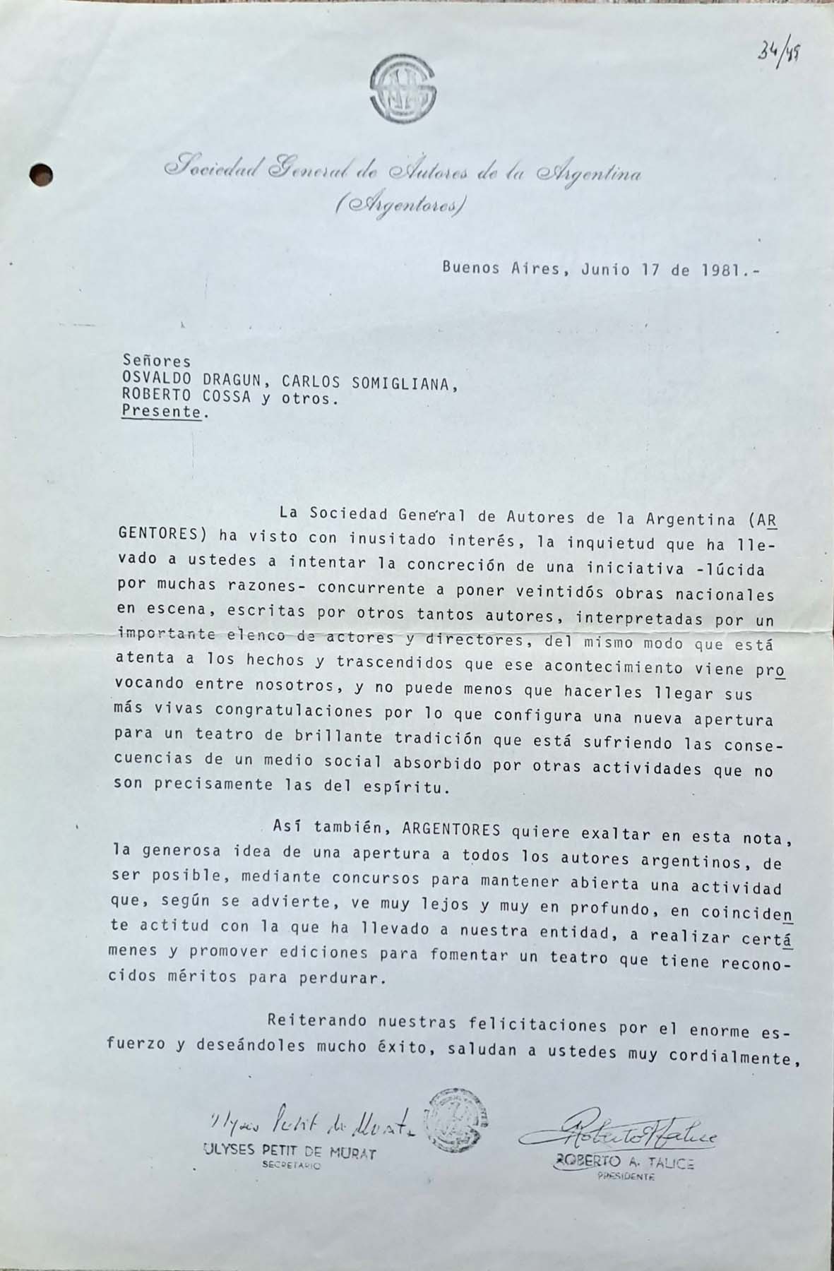 Carta en la que Argentores saluda a los autores quen impulsaron Teatro Abierto 1981. 17.06.1981.