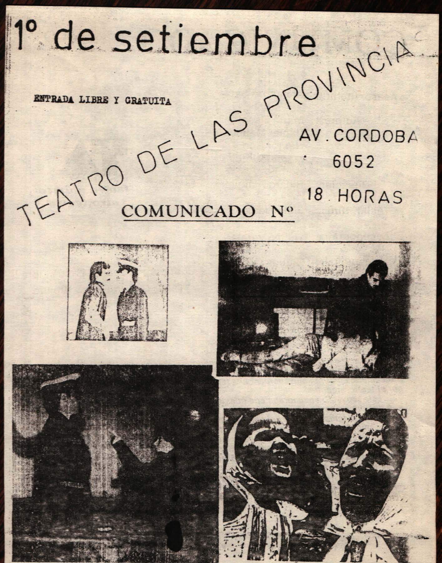 Título: Comunicado N°. Elenco: Marta Casal; Daniel Mancuso; Néstor Roo; Marcelo Vitulio. Dramaturgia y dirección: Ricardo Miguelez. Asistente de dirección: Julio Nemo. Escenografía : Rubén Varela. Maquillaje: Claudio Mori. Dirección de vídeo: Jorge Abad. Asesor Literario: Alejandro Seta