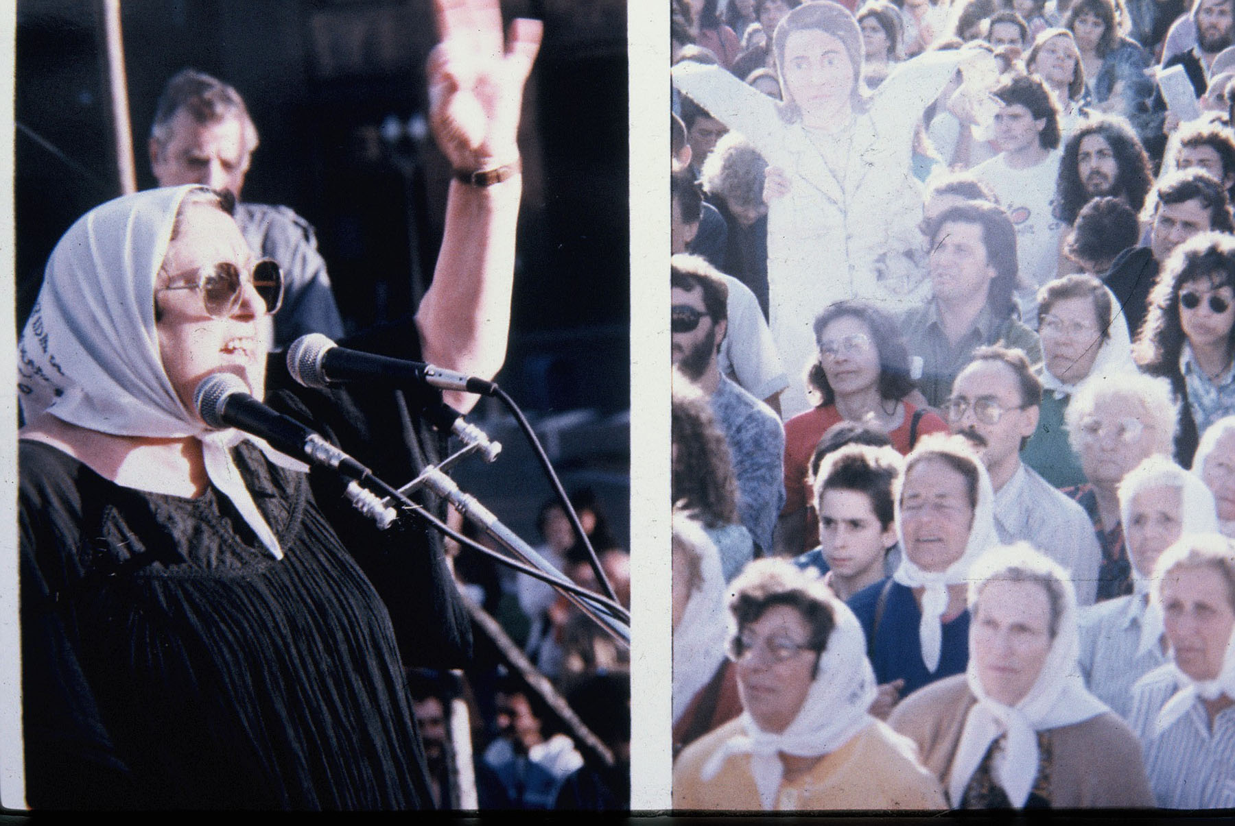 Dos imágenes, una en la que se ve a Hebe de Bonafini hablando sobre un escenario, en la otra madres y manifestantes escuchándola, se destaca una silueta que representa a un maestro, en el marco del recital de Anmesty International.