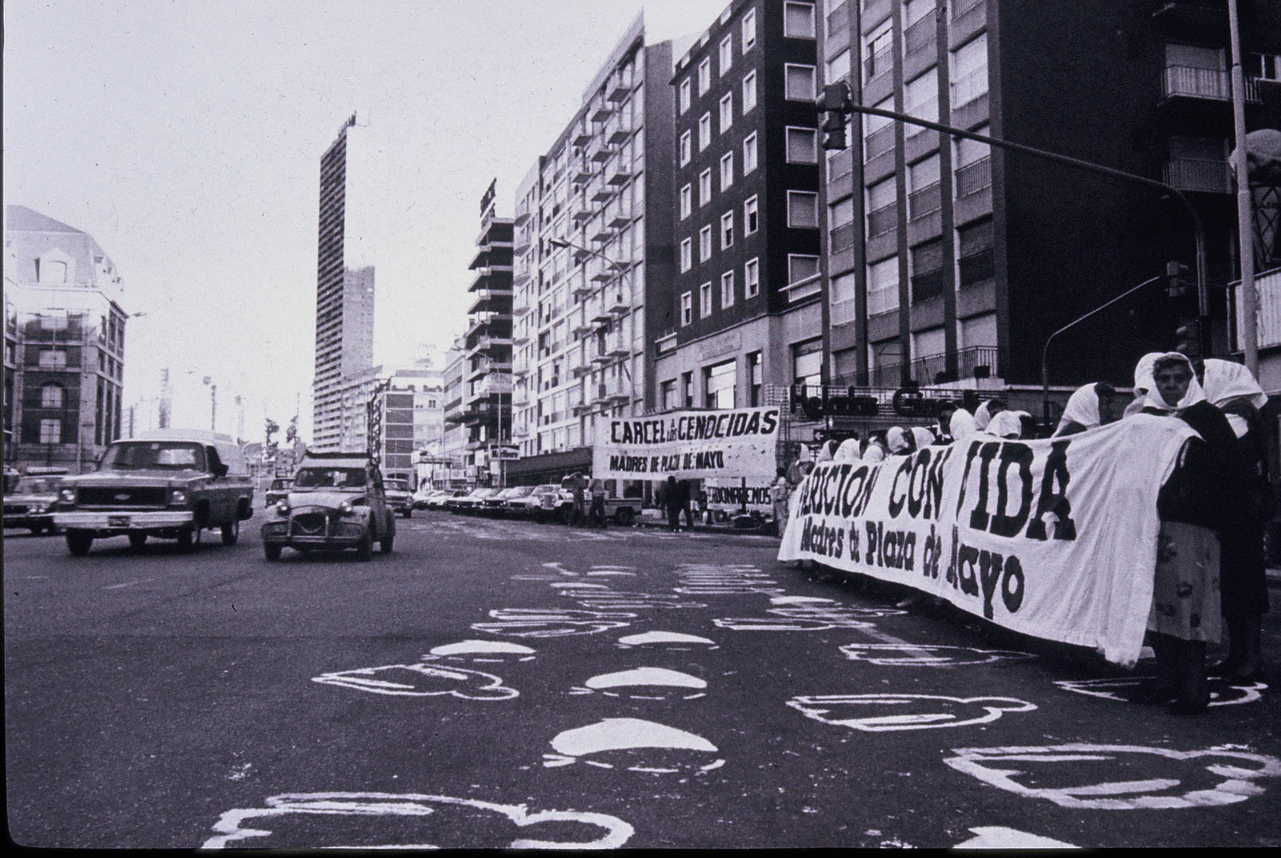 Madres de Plaza de Mayo tras la bandera "Aparición con vida", pasacalle Cárcel a los genocidas enfrente del Hotel Provincial y casino de Mar del Plata