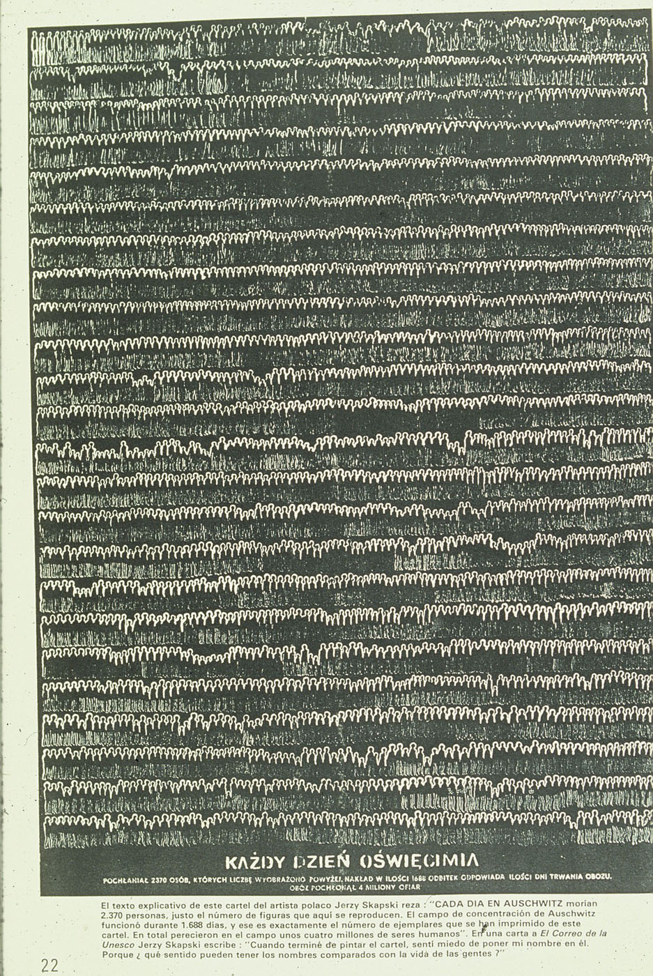 Cartel realizado por el artista polaco Jerzy Skapski reproducida en la revista El Correo de la UNESCO de octubre de 1978, disparador de la idea de los artistas visuales que crearon el procedimiento de El Siluetazo
