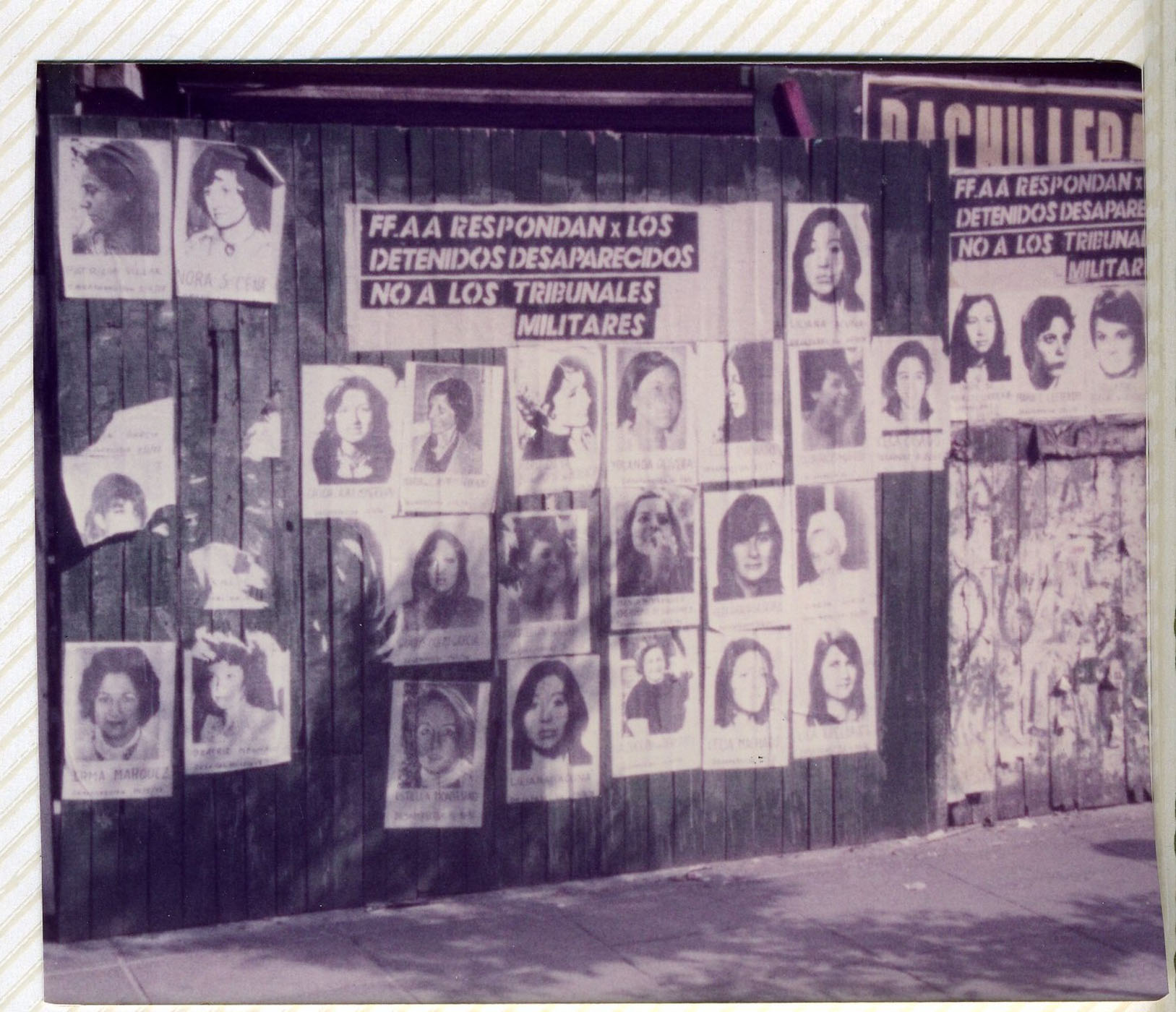 Muro con fotocopias con imágenes de mujeres desaparecidas. Se lee también la consigna: FFAA Respondan por los desaparecidos. No a los tribunales militares.