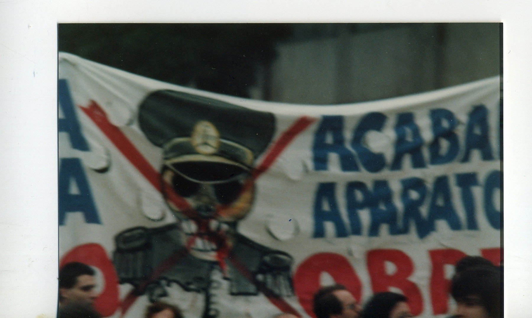Pancarta del Partido Obrero con dibujo de un militar calavérico tachado en una marcha contra la amnistía