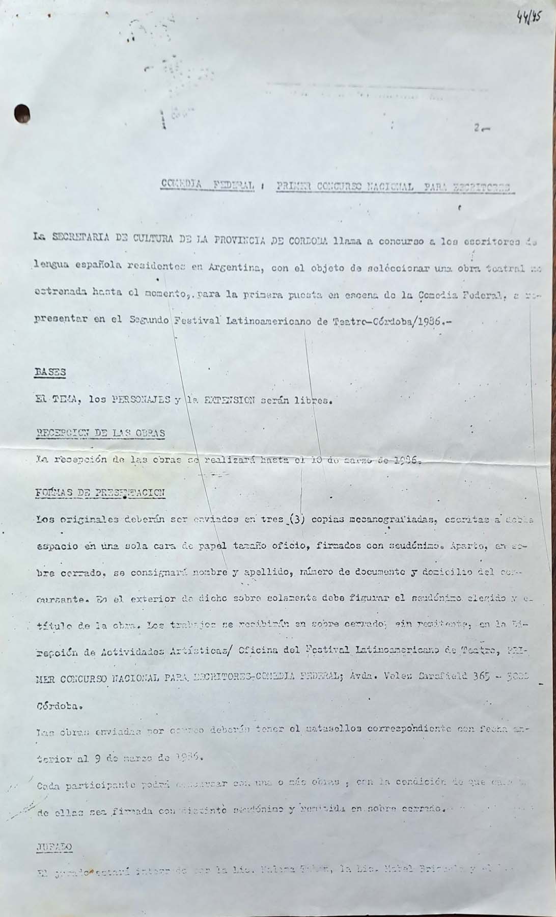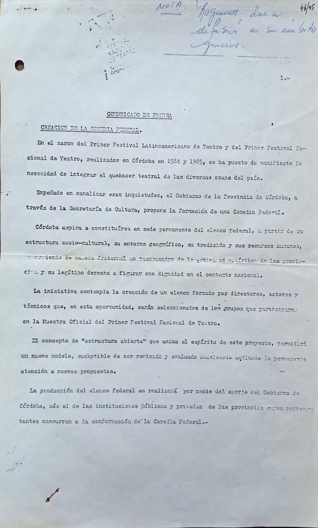 Comunicado de prensa de la Secretaria de Cultura de Córdoba acerca de la creación de la Comedia Federal en el marco del 1° Festival Nacional de Teatro. 1985.