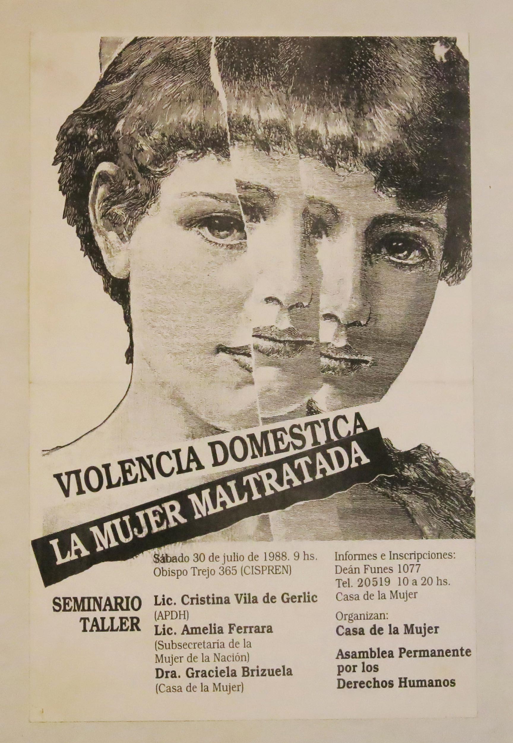 Afiche impreso en blanco y negro. Se lee: “Violencia doméstica. La mujer maltratada”, en el centro dibujo de una mujer como recortado. Convocan a un "Seminario taller".