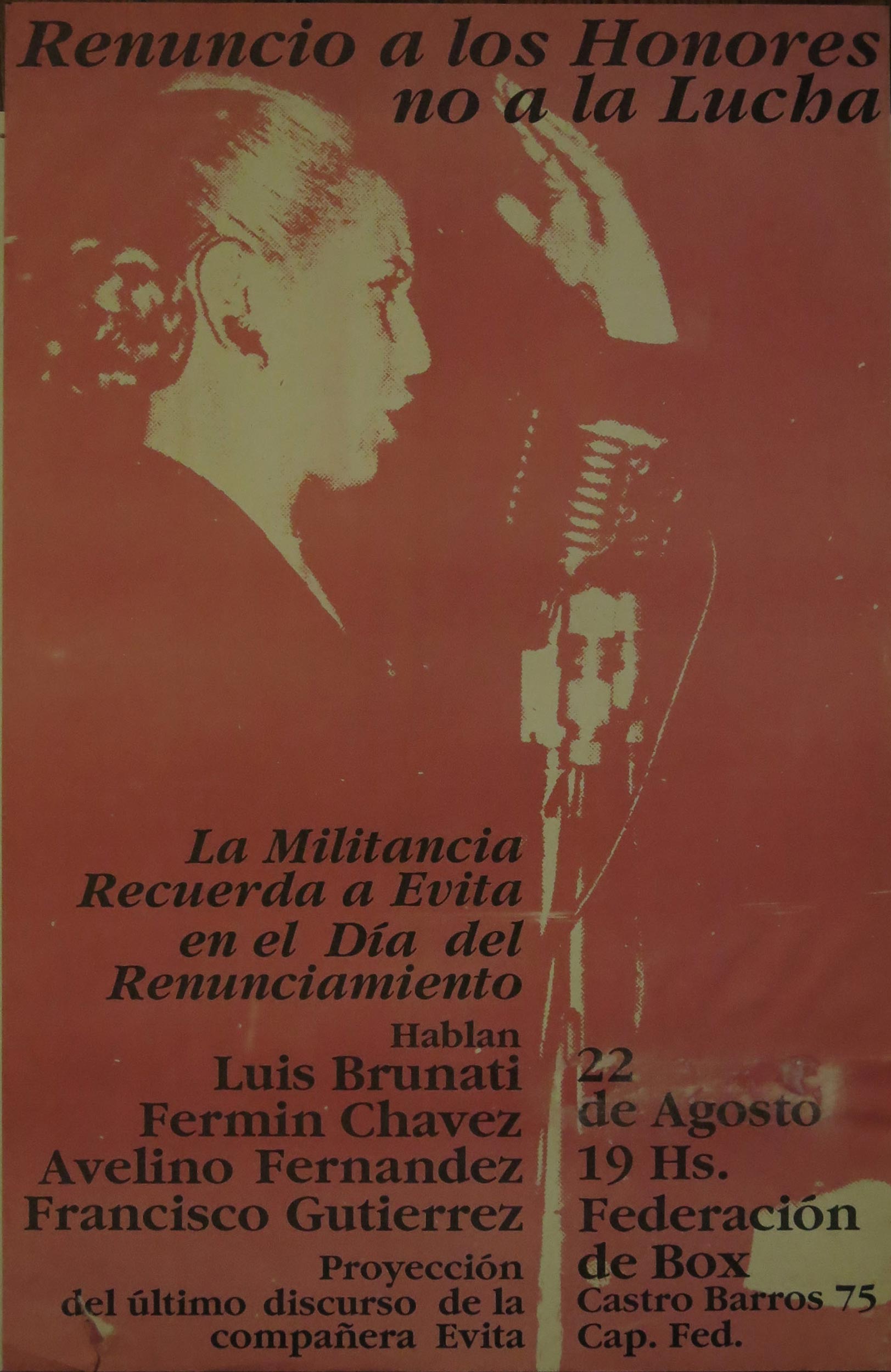 Impreso en rosa y blanco con imagen de Eva Perón dando un discurso. Se lee: “Renuncio a los honores, no a la lucha. La militancia recuerda a Evita en el día del renunciamiento. Hablan Luis Brunati, Fermín Chavez, Avelino Fernández y Francisco Gutierrez".
