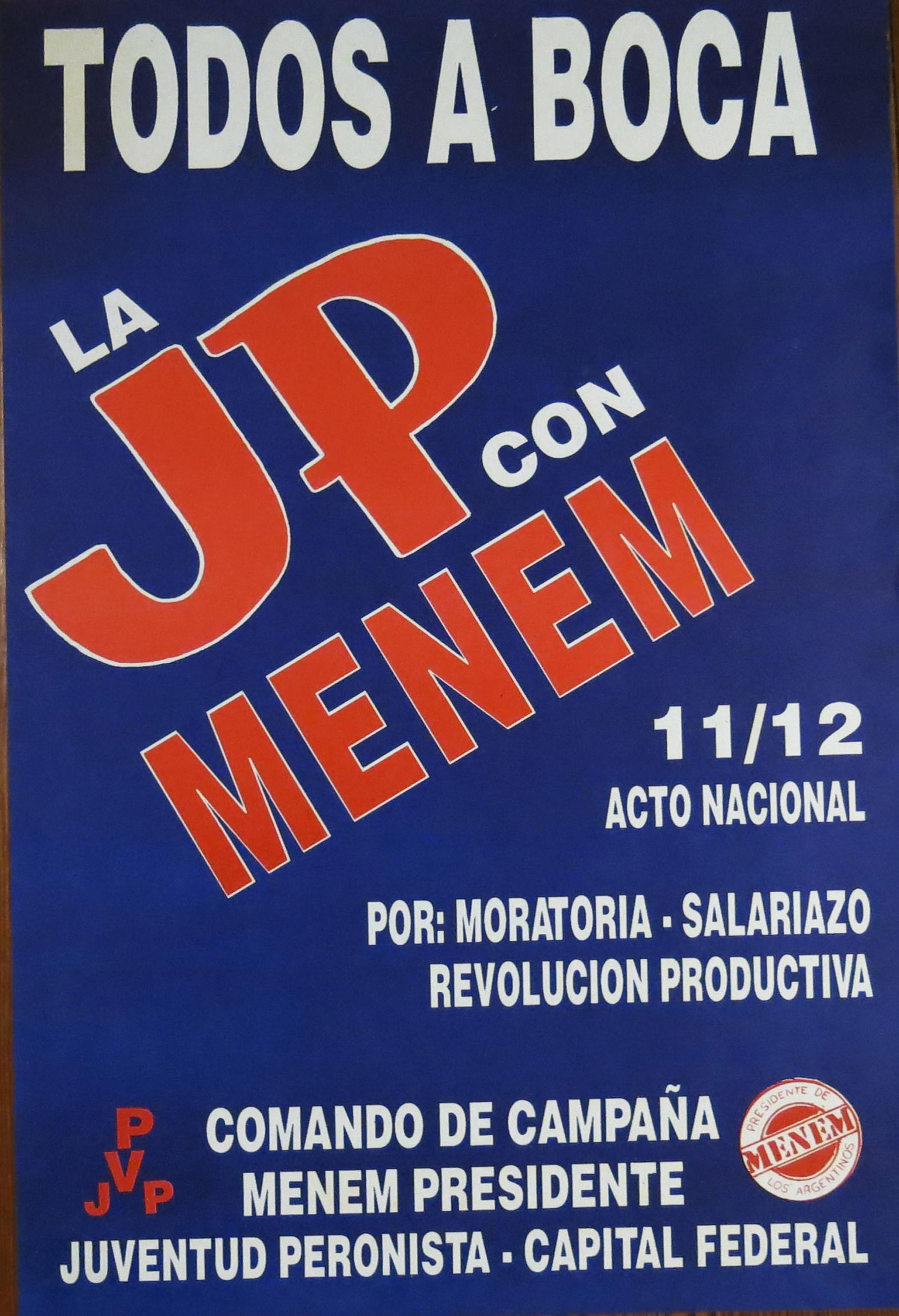 Afiche de fondo azul con letras en blanco y rojo, sin imágenes. Se lee: “Todos a boca. La JP con Menem. 11/12 Acto Nacional. Por moratoria-Salariazo-Revolución productiva. Comando de Campaña Menem Presidente. Menem, presidente de los argentinos.”
