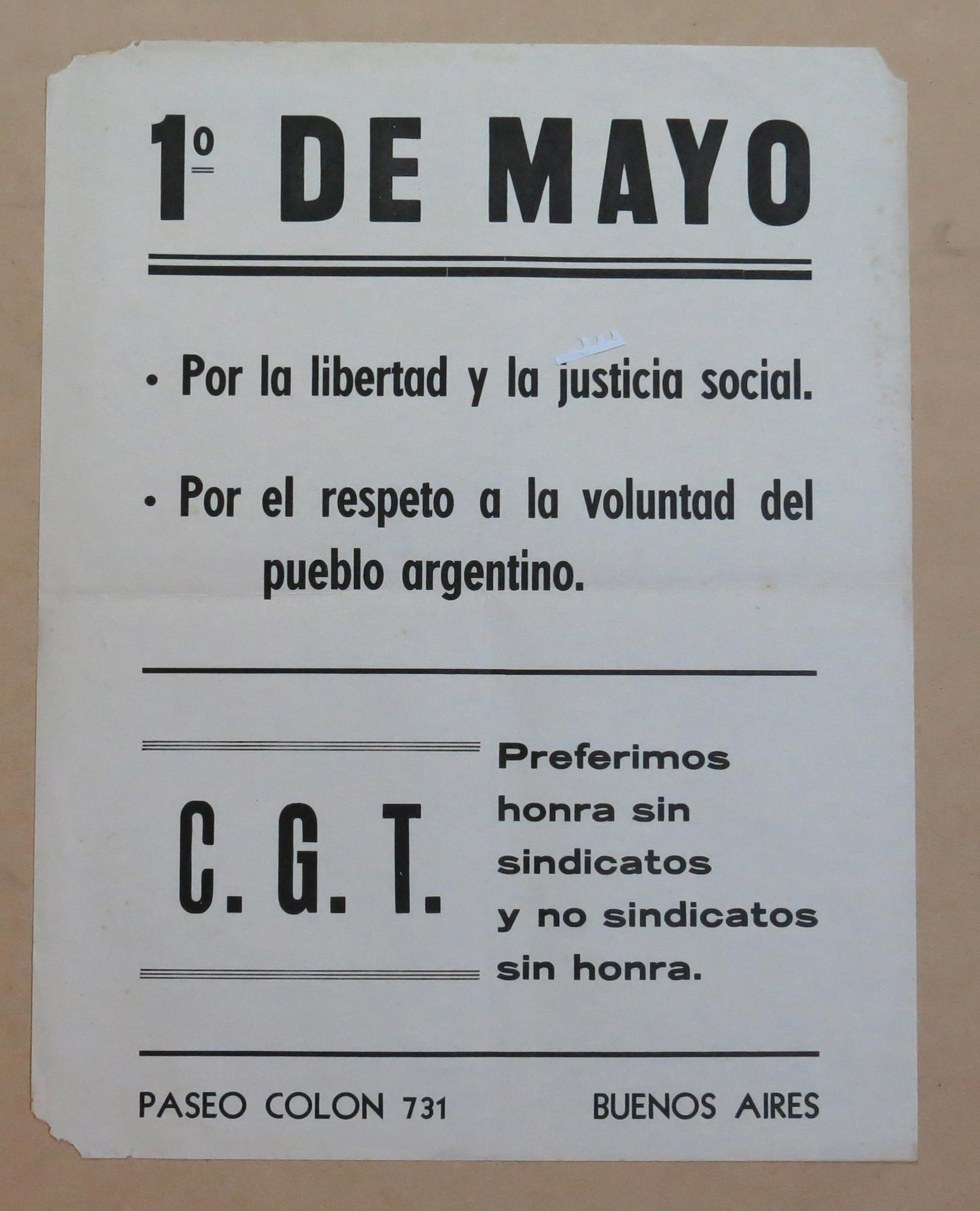 Afiche en blanco y negro, se lee: “1° de mayo. Por la libertad y la justicia social. Por el respeto a la voluntad del pueblo argentino. CGT Preferimos honra sin sindicatos y no sindicatos sin honra. Paseo Colón 731. Buenos Aires”.