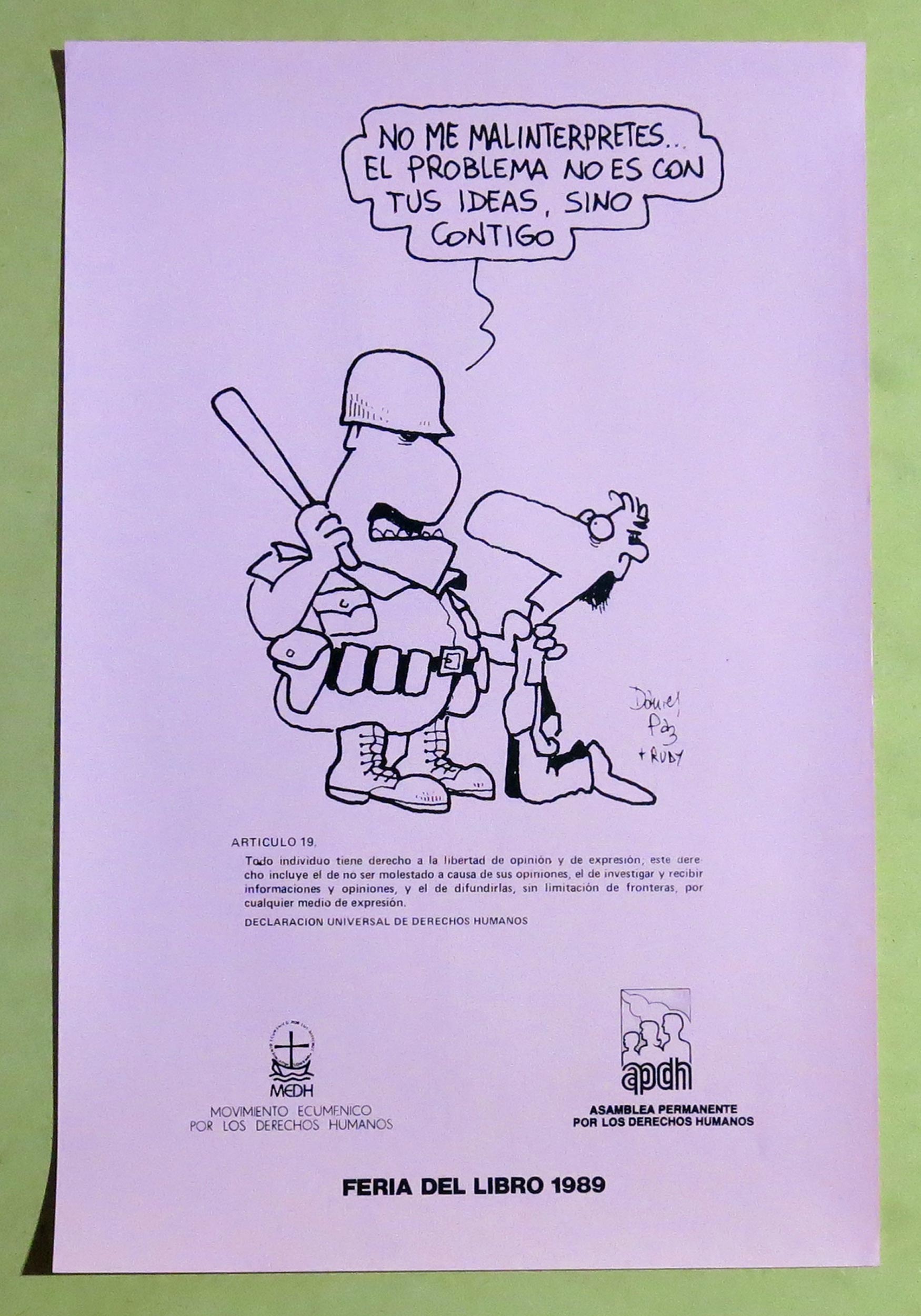 Viñeta de Daniel Paz y Rudy, un militar agarrra por el cuello a un hombre de civil y el primero dice: "No me malinterpretes... el problema no es con tus ideas, sino contigo". A continuación se reproduce el artículo 19 de la Declaración Universal de Derechos Humanos.